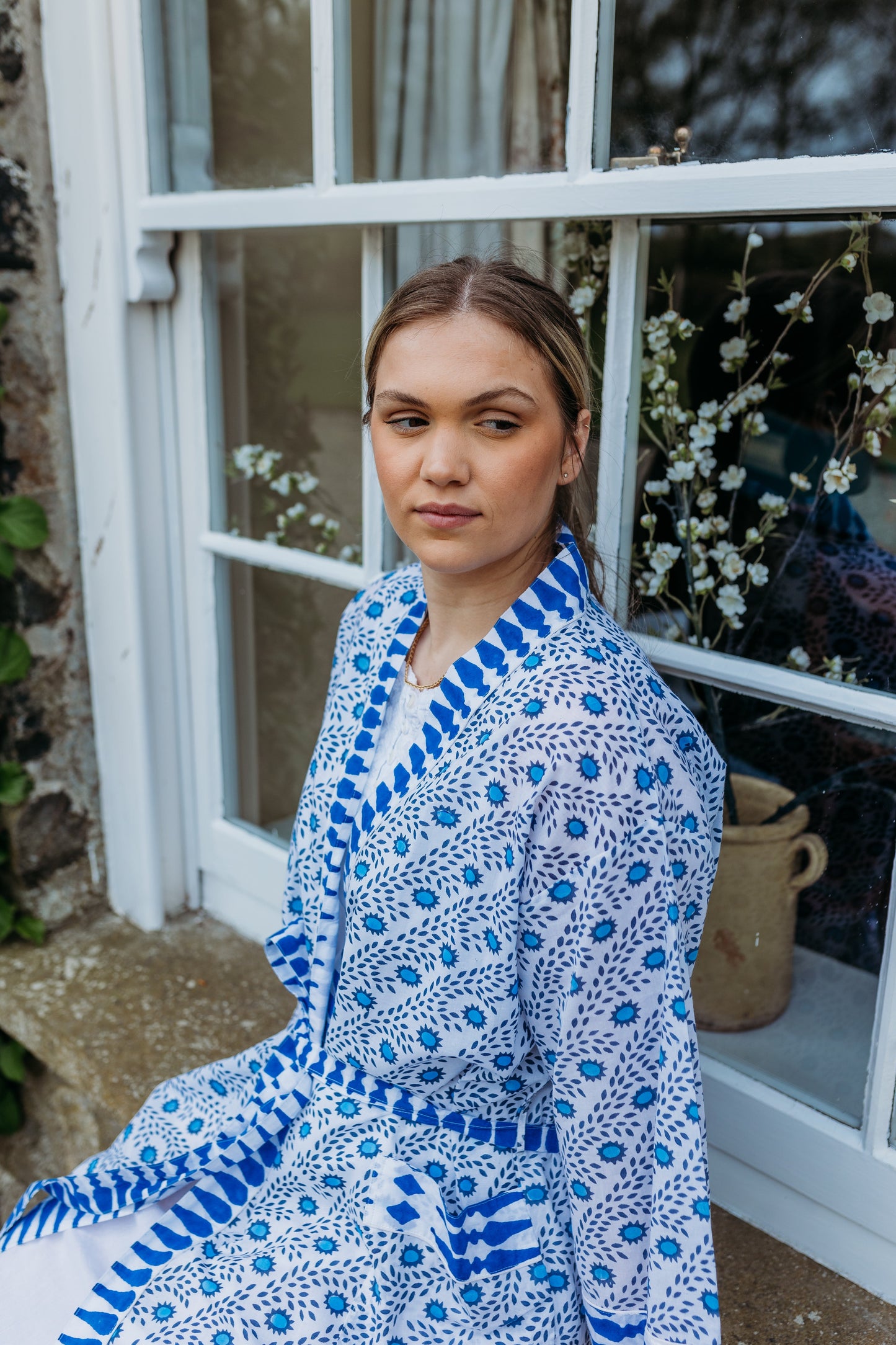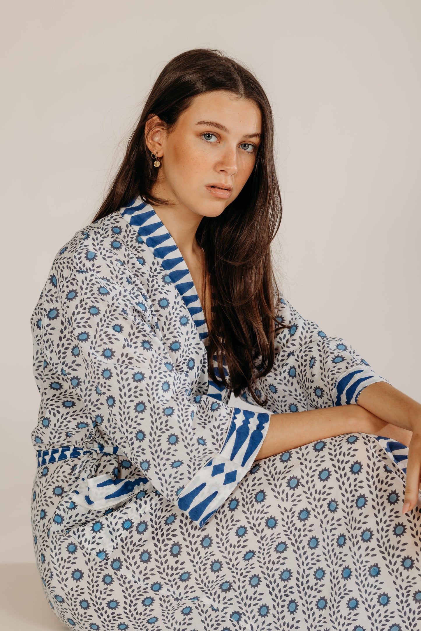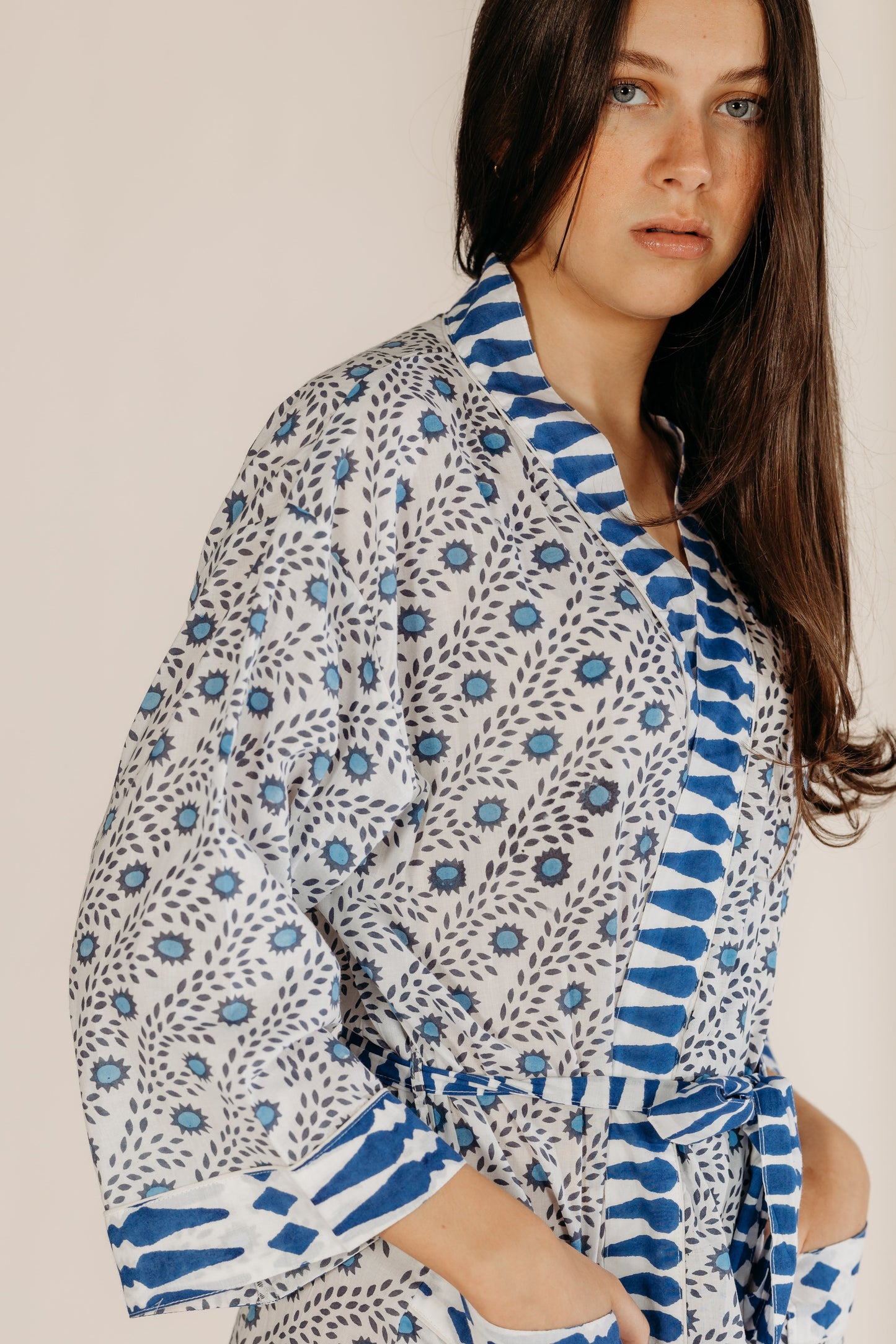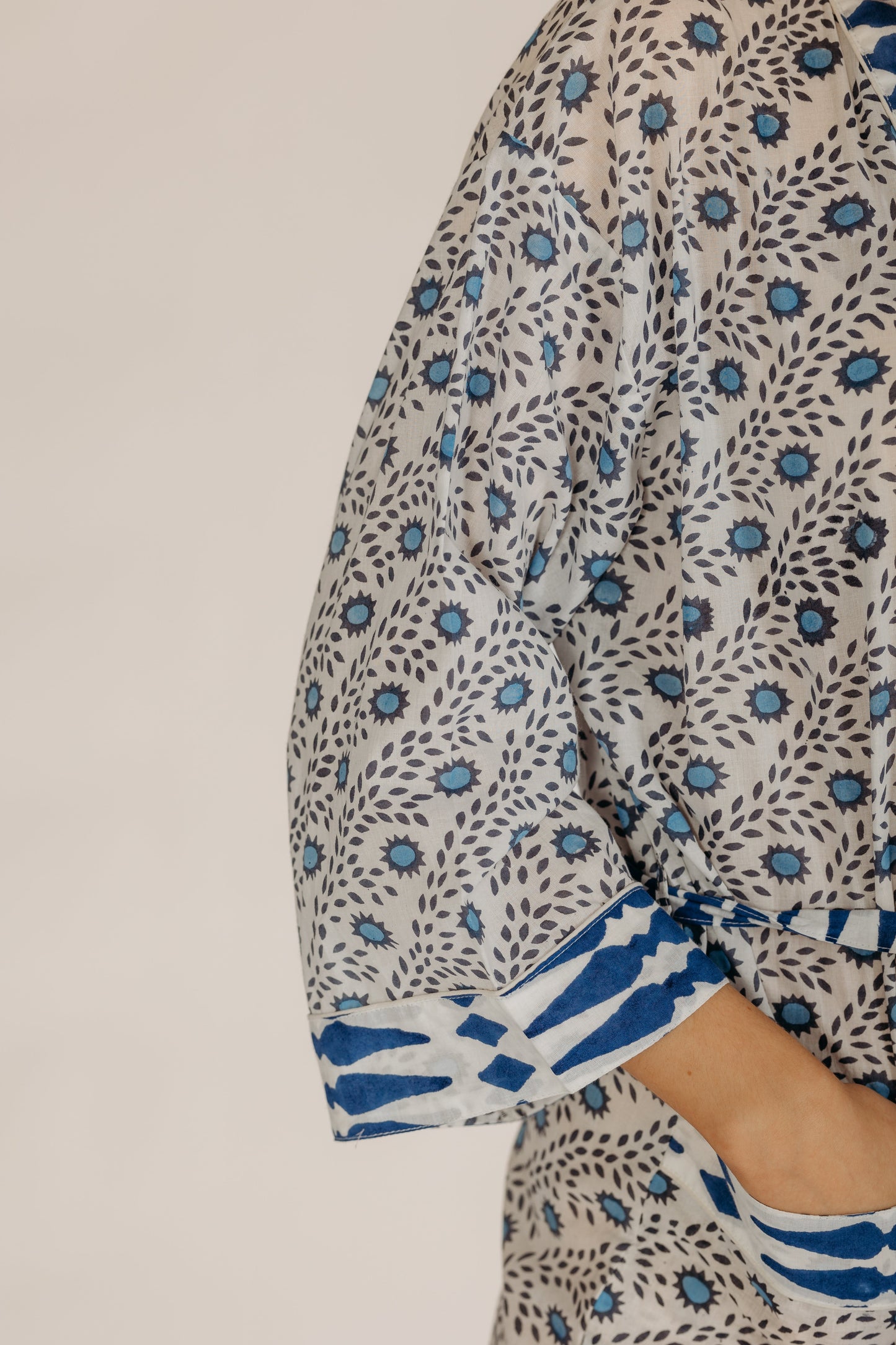 Wrap yourself in comfort with our hand block printed cotton robe, made from 100% natural fabric by our small team in India. Perfect for summer holidays, it's like taking a friend on holiday. This generously sized robe features two front pockets and makes an ideal bridesmaid gift. Versatile and stylish, it's great for lounging, beach cover-ups, or post-bath relaxation.Hand block printed by our small team in India