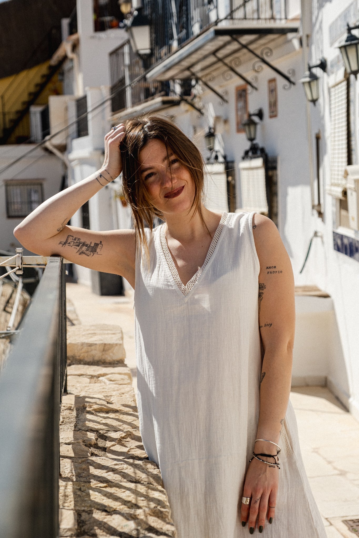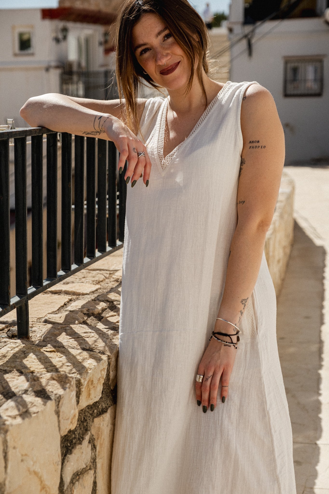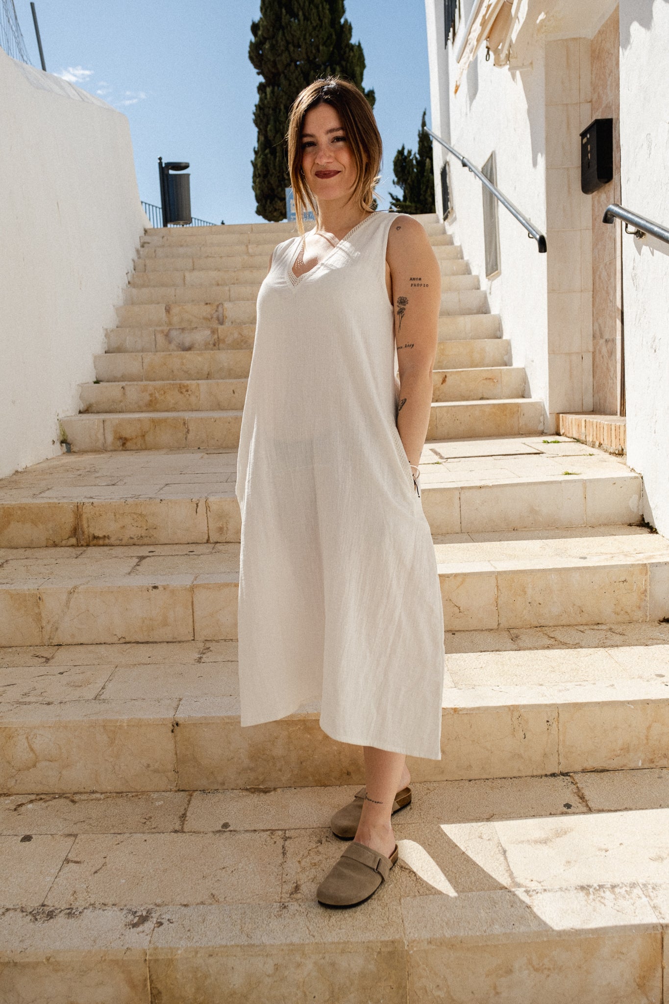 Perfect for a stroll on the beach or lounging at home, this 100% organic cotton A-line dress is all about effortless style. With a flattering V-neck and delicate lace inserts, it adds a touch of charm. Handy lace-trimmed side pockets and a straight hem make it as practical as it is pretty. It would be a shame to wear it at home and not show it off—pair it with some sandals or a denim jacket for an effortlessly chic look. Embrace comfort and elegance in this versatile piece, ideal for any laid-back day