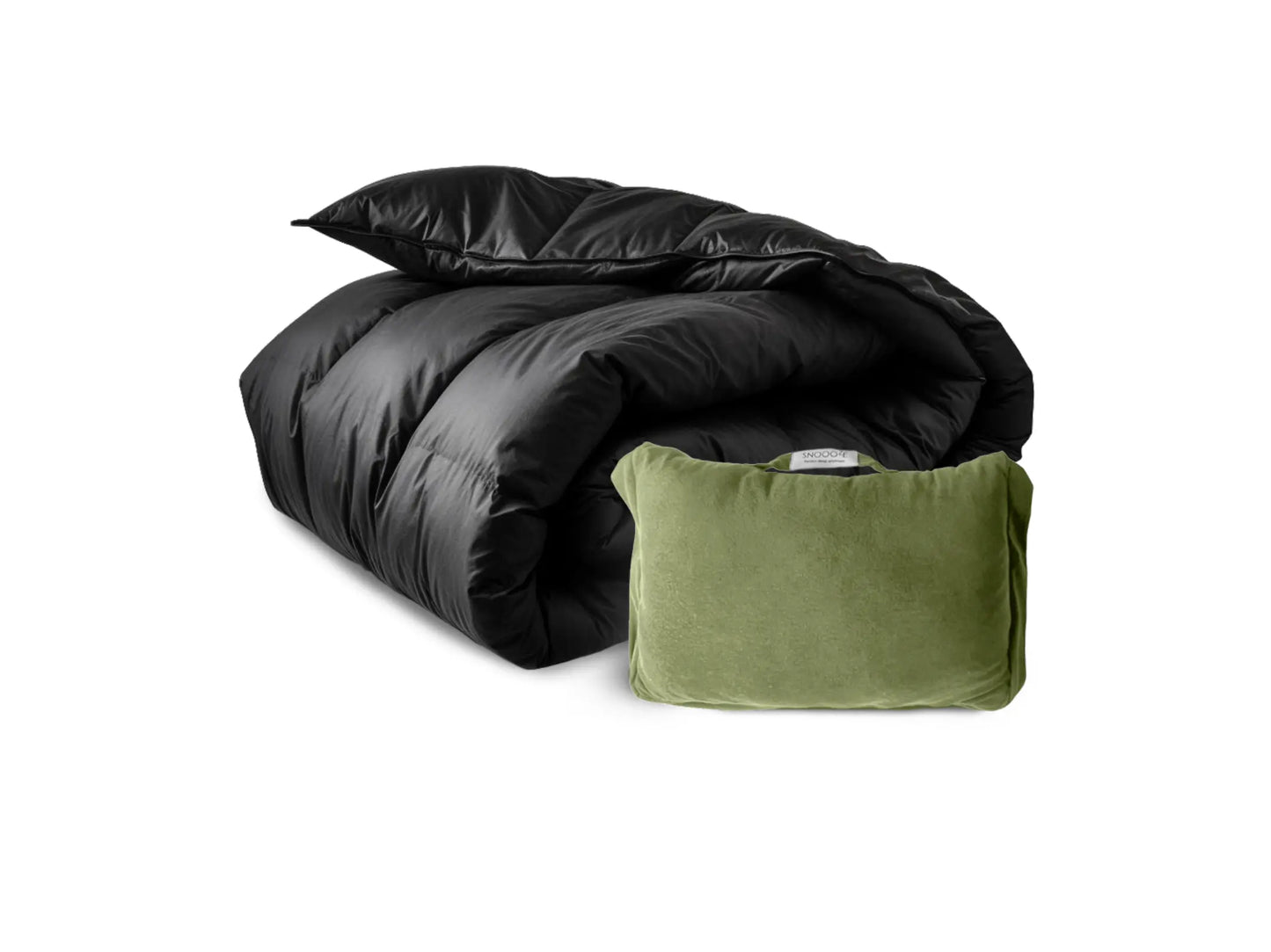 Compact & Versatile: Designed with the traveler in mind, this duvet effortlessly compresses into a cozy, pillow-shaped case made from synthetic black fiber that is as chic as it is practical.