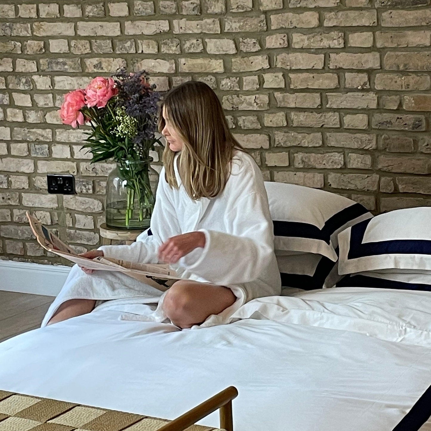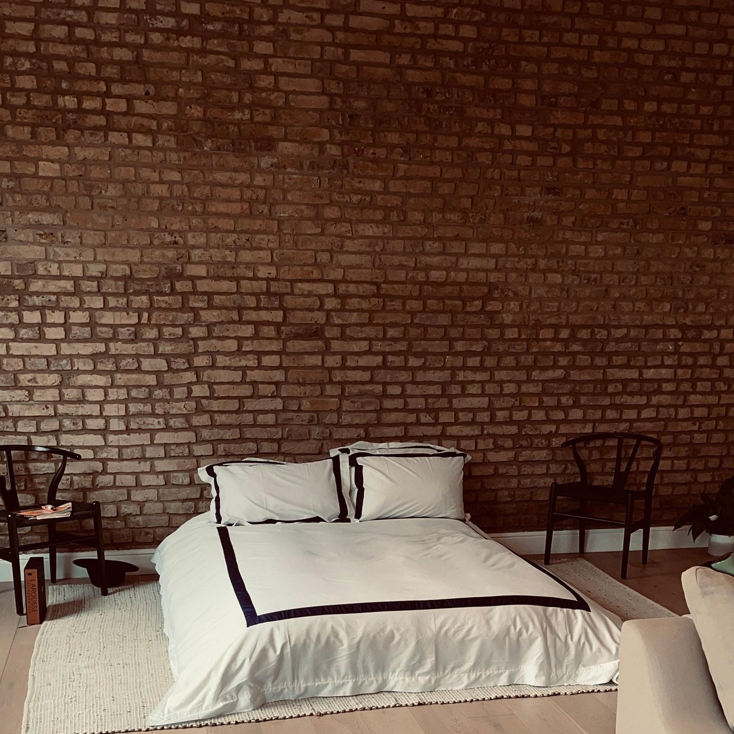 The duvet cover and pillow cases feature a rich Navy border along all sides. Sustainably and ethically made of surplus factory fabric in 400 thread count cotton with a luxe sateen finish giving it a buttery soft feel and an ever so slight glow.