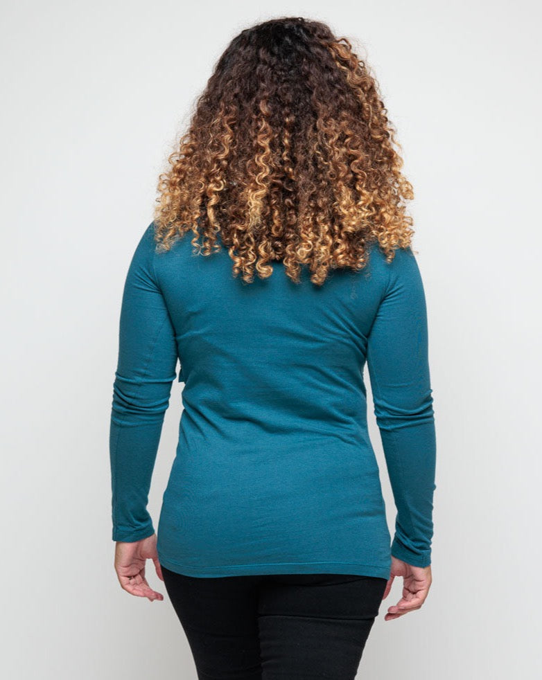 This teal long sleeve t-shirt ensures all-day comfort with a gentle hand feel that's both sustainable and eco-friendly. Elevate your nursing wardrobe with this essential breastfeeding piece, blending style, comfort, and functionality at every stage of motherhood.