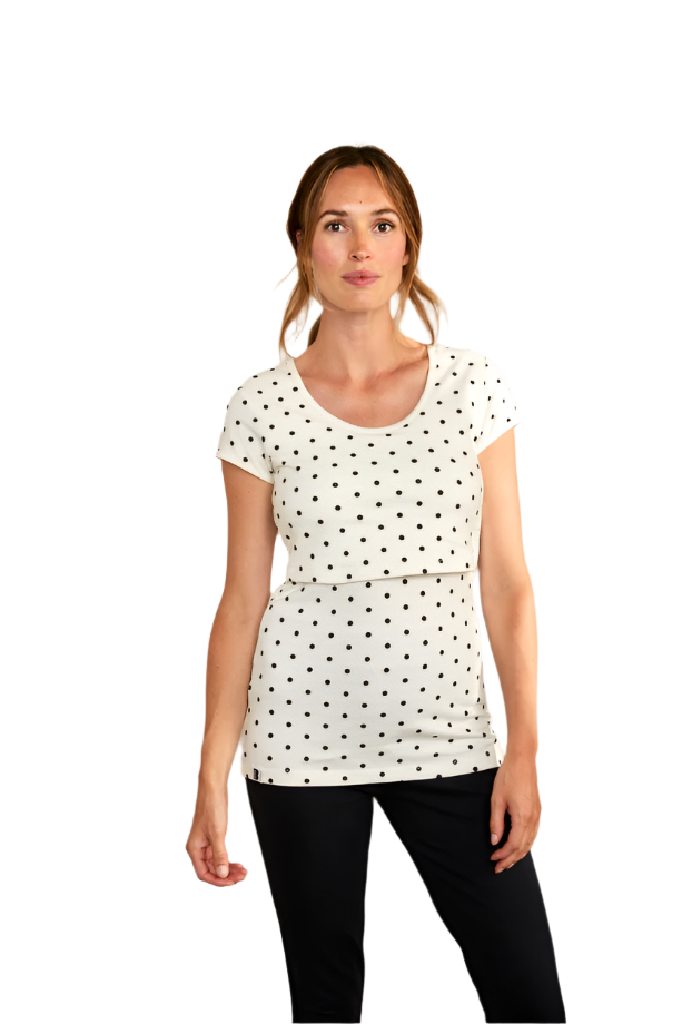 This white and black spots t-shirt ensures all-day comfort with a gentle hand feel that's both sustainable and eco-friendly. Elevate your nursing wardrobe with this essential breastfeeding piece, blending style, comfort, and functionality at every stage of motherhood.