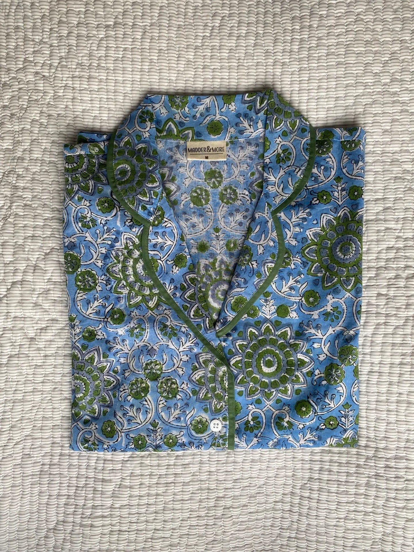 Our block printed long pyjama sets are handmade in Jaipur. The fabric is hand printed so please allow for discrepancies in designs as each set is unique.