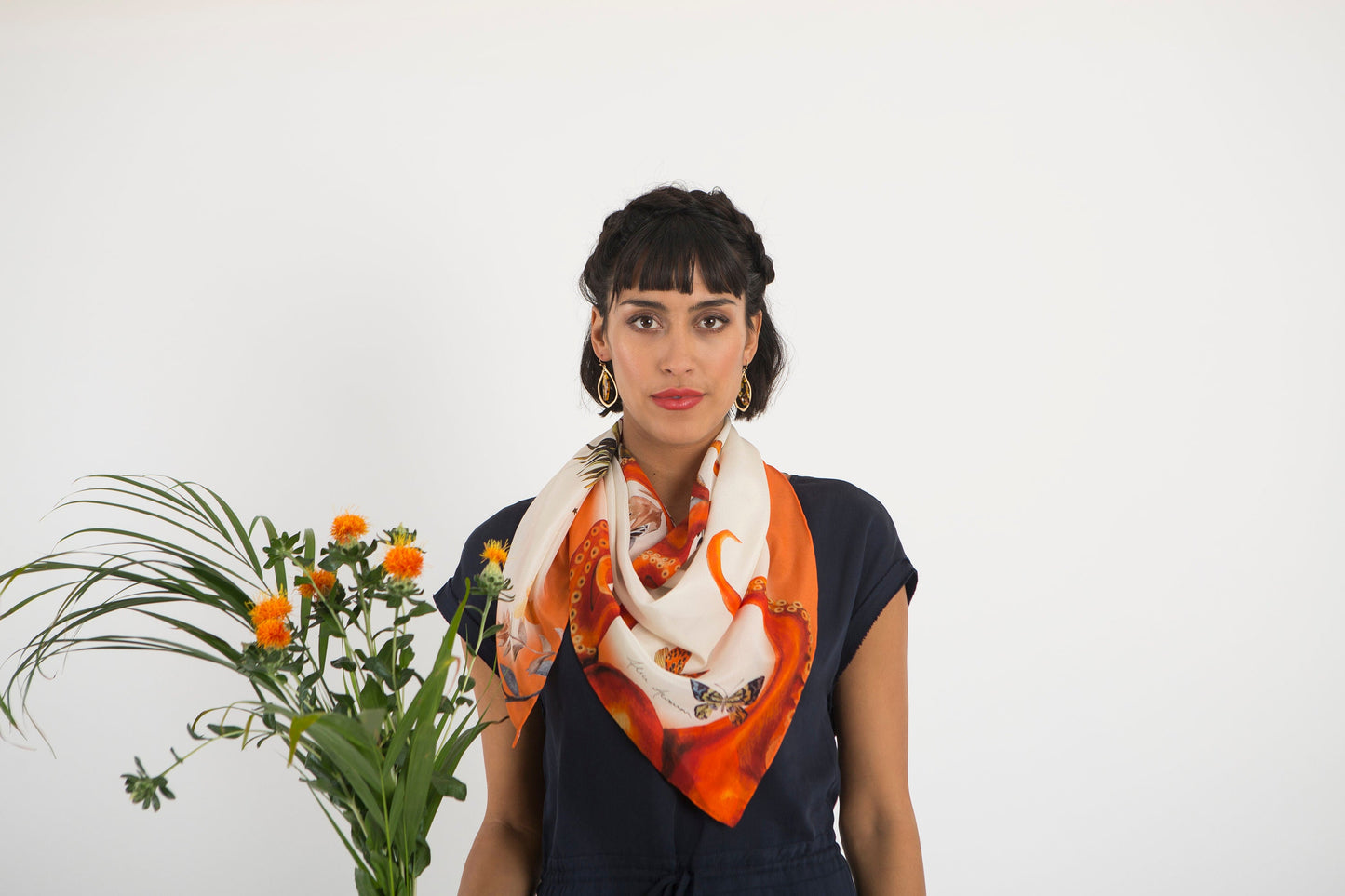 There are a variety of ways to style this scarf, the orange tentacles which creep from the lower right corner make an interesting feature when worn around the neck