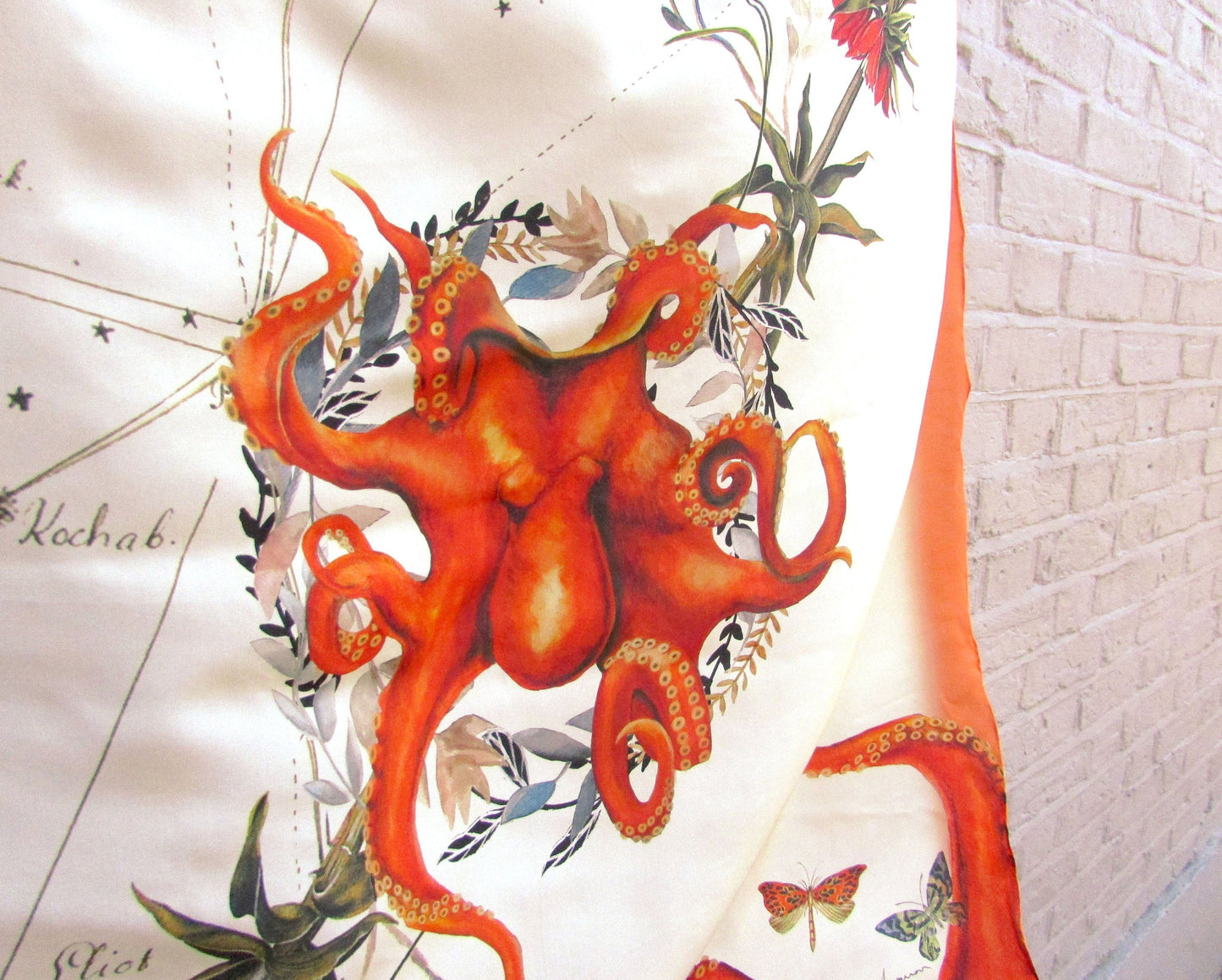 Inspired by the traditions of textile design and the discipline's developments to embrace more modern techniques, the Evolution collection contrasts tradition with unique, innovative creation. This digital print scarf features a striking hand painted orange Octopus with coiling tentacles and references the belief that this fascinating creature is able to predict the future. Also incorporated into this unusual design is the vintage style star chart, another reference to future prediction and scientific discovery.