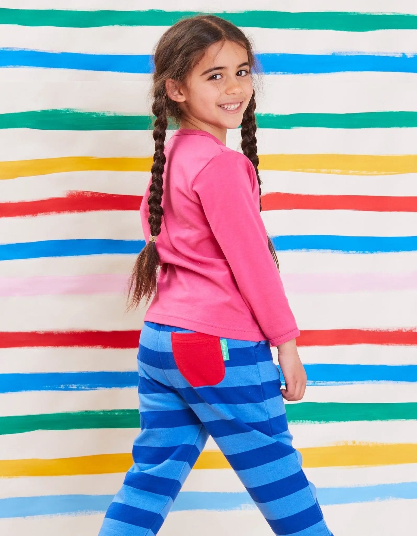 Little ones will be ready for anything in these super comfy contrasting stripy blue organic kids joggers. The soft organic cotton with comfy waistband and stretchy cuffs will keep little legs cosy and warm too. Mix and match with our organic applique or colourful basic T-shirts! Love these joggers? Check out our full collection of organic childrenswear joggers in bright and bold colours online at Toby Tiger.