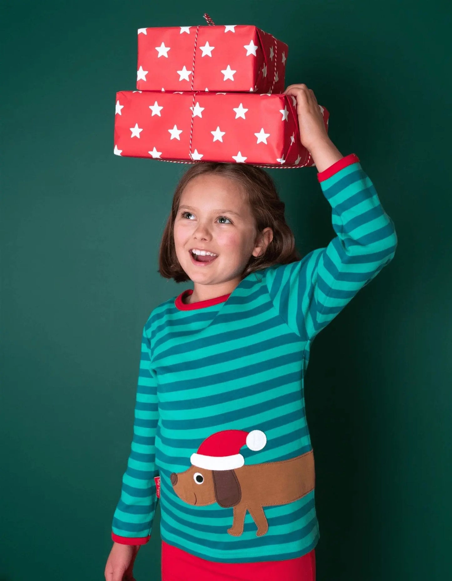 Our miniature sausage dog is keeping warm thanks to her festive hat - and this kids organic Christmas top will keep your little ones warm all season too! Long sleeves and super soft organic cotton ensure cosiness, while contrasting green stripes with a bright and bold red trim add to the festive feel. Love our nod to Christmas? You can find our festive organic childrenswear online at Toby Tiger.