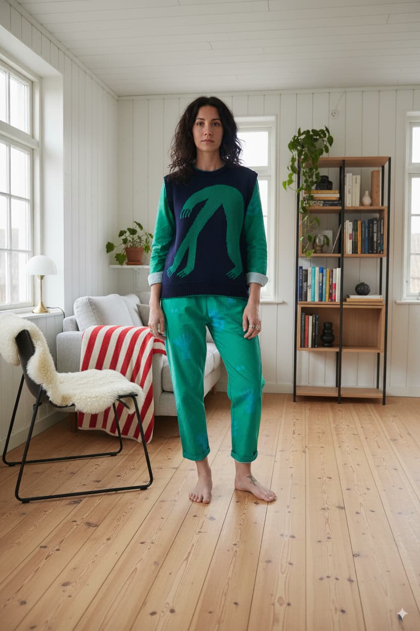 Step into bold comfort with our organic cotton knitted vest. This sleeveless jumper showcases a bold green figure on a navy background, finished with contrast green trim. Designed for multi-season wear, it layers effortlessly over shirts and dresses or works as a standalone statement piece in warmer months. A versatile style with a graphic edge, made to elevate your everyday wardrobe.