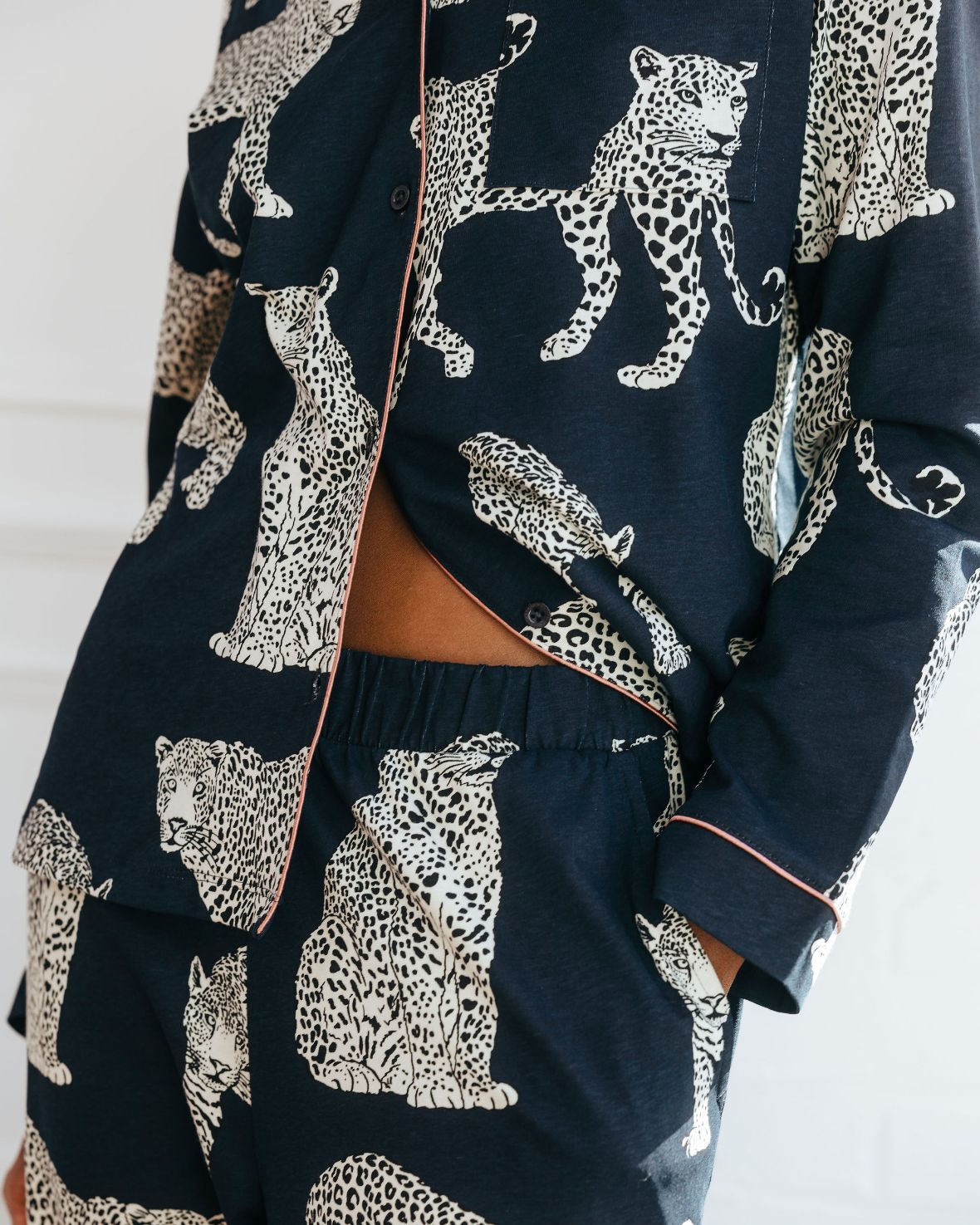 Against a midnight hue navy blue background, white leopards prowl on these organic cotton pyjamas.