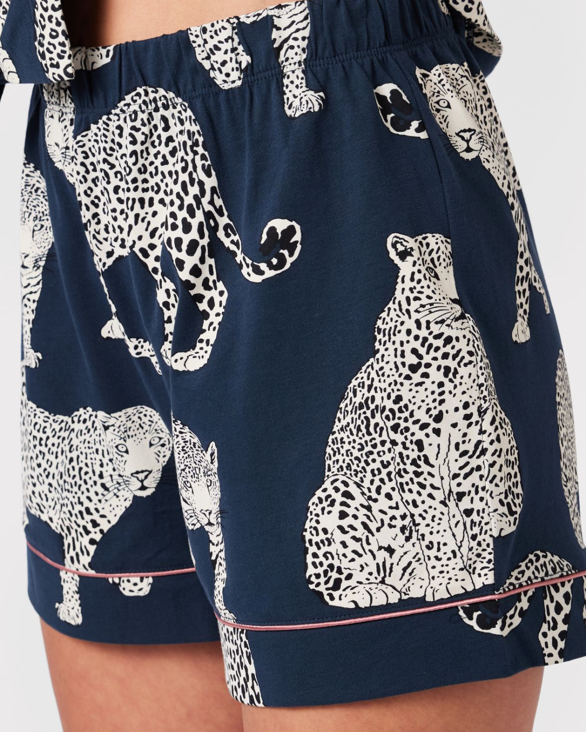 Against a midnight hue navy blue background, white leopards prowl on these organic cotton pyjamas.