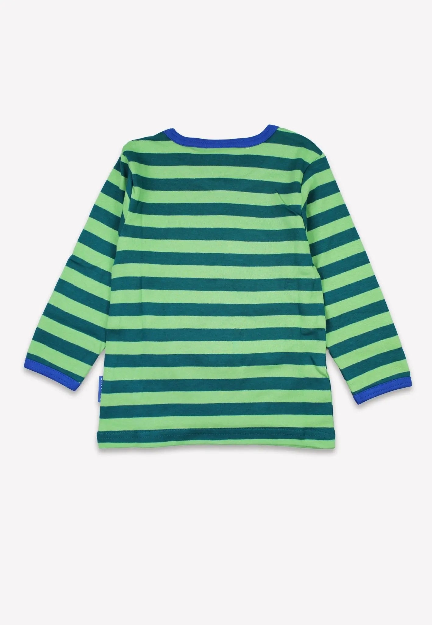 Unleash your child's wild side with our Organic Green Tonal Dinosaur Applique T-Shirt! Made with organic materials, this vibrant striped shirt features a playful blue dinosaur applique and cool blue trim. Perfect for your little one who loves all things prehistoric!