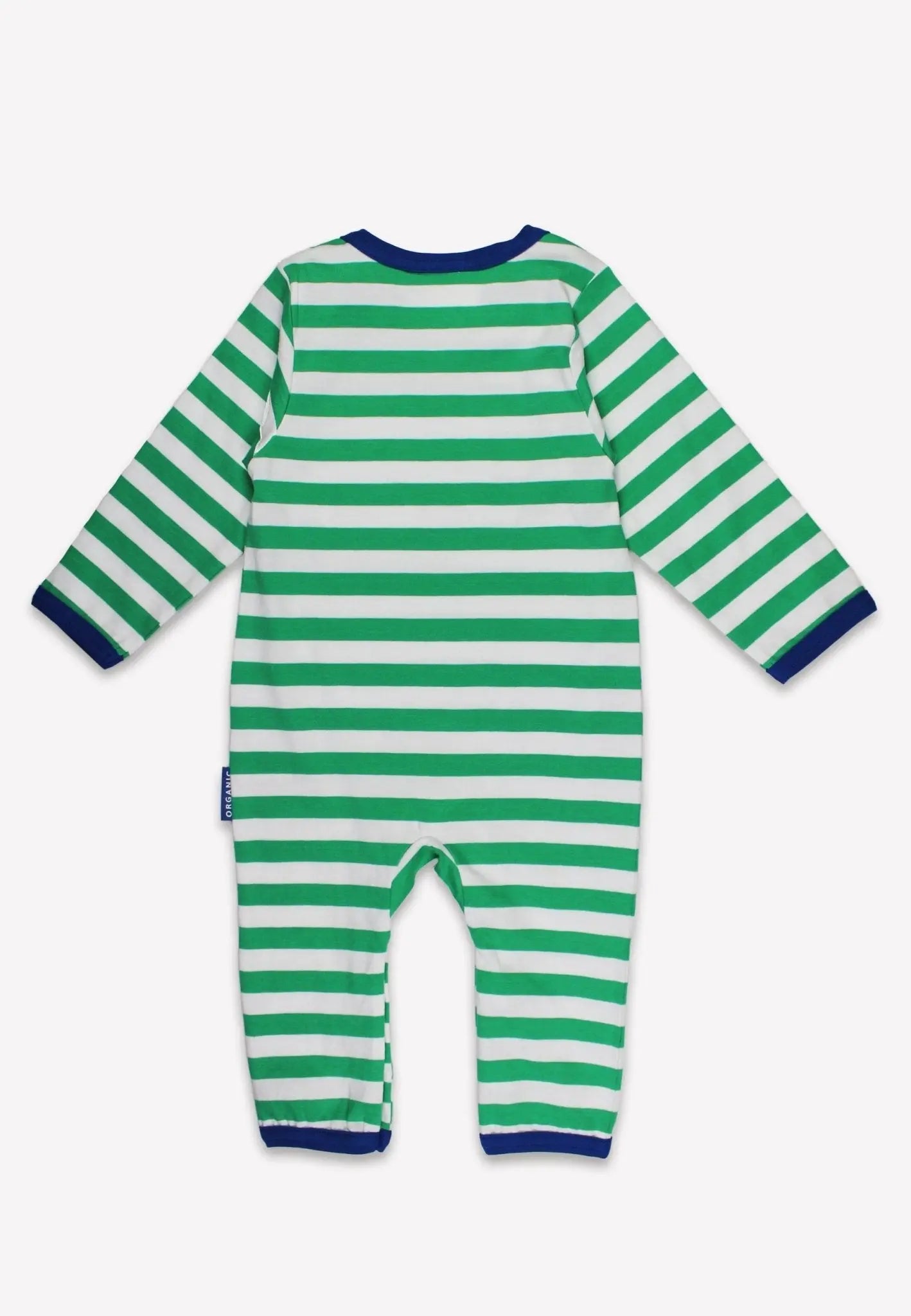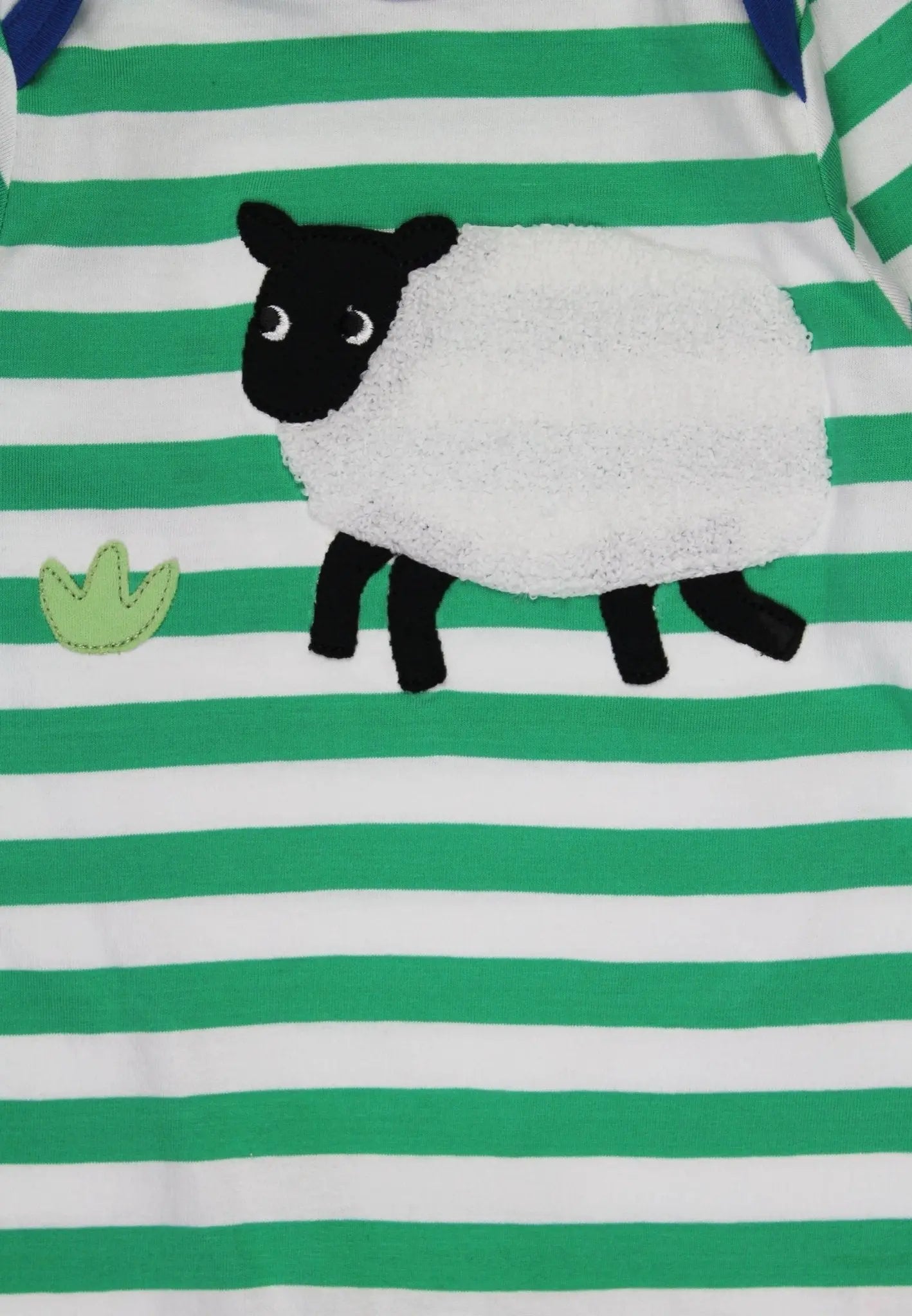 Introducing our Organic Hillside Sheep Applique Sleepsuit! Made with 100% GOTS-certified organic cotton, this green and white striped sleepsuit features a playful fluffy sheep applique and convenient leg poppers for easy nappy changes. Perfect for little ones to explore the countryside in style.