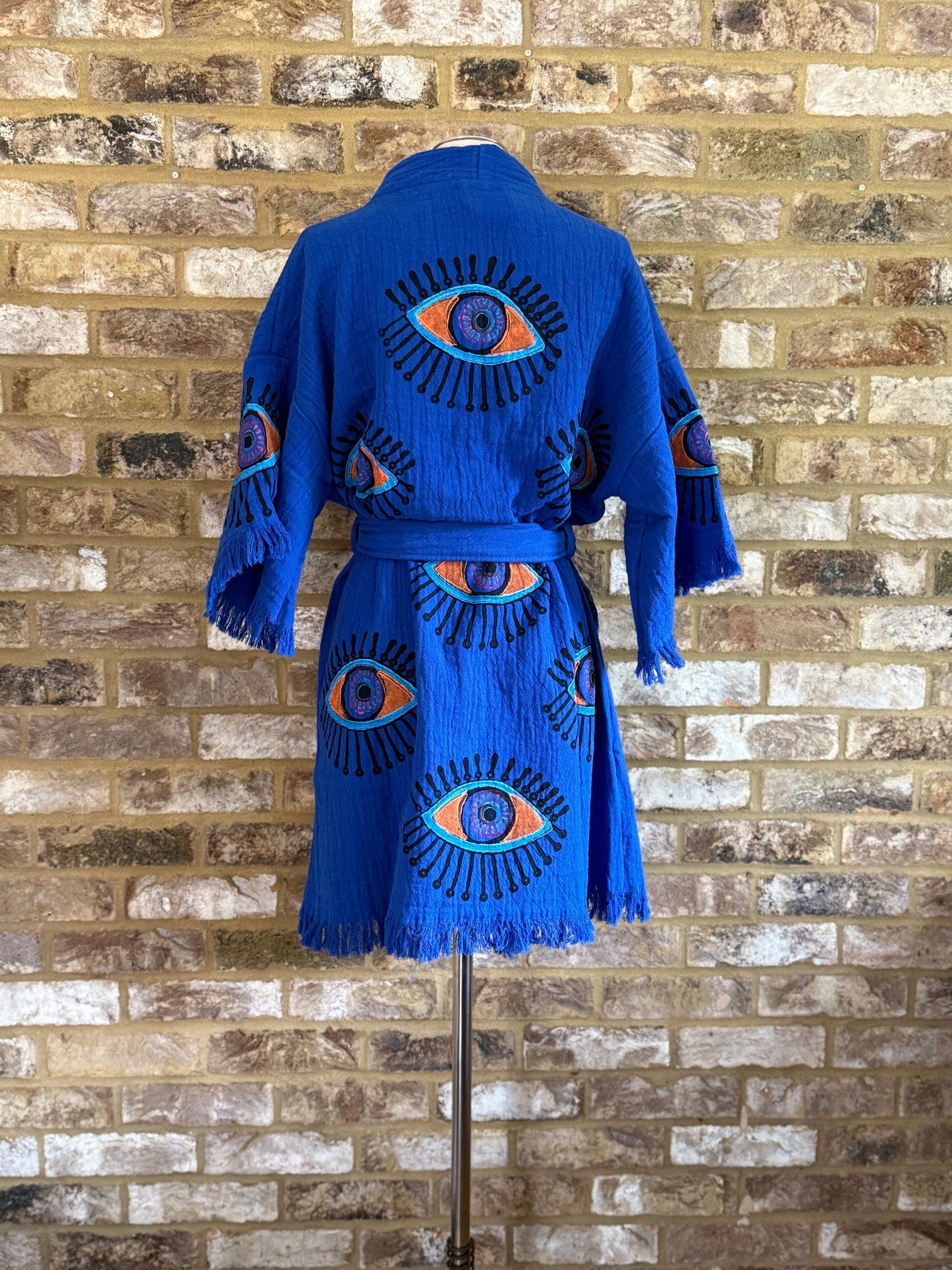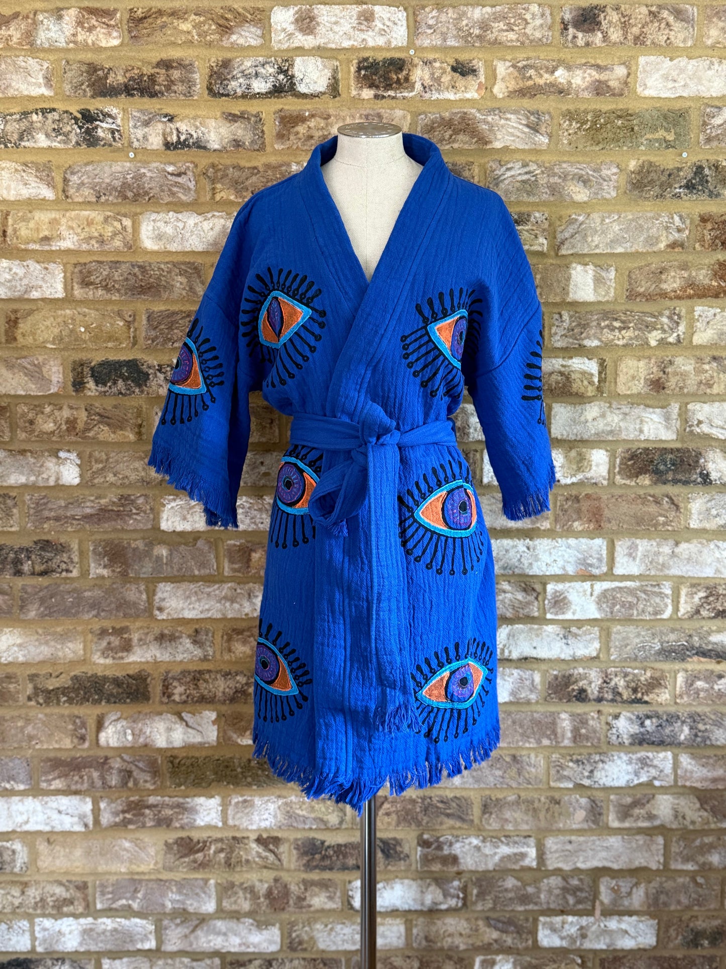 This gorgeous blue kimono shortie is the same colour and design as our full-length robe, just in a shorter style.