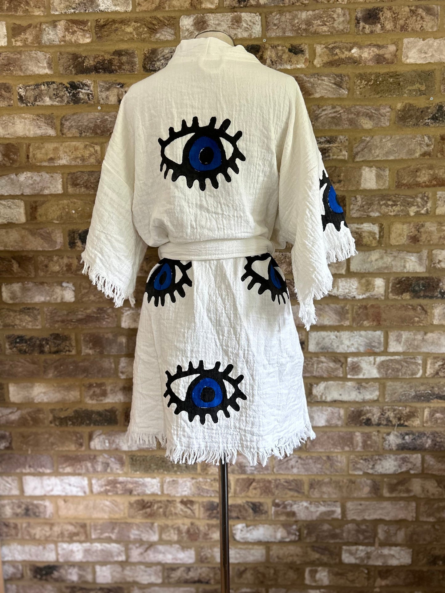 Organic Kimono in White with Dark Blue & Black Eye: Short