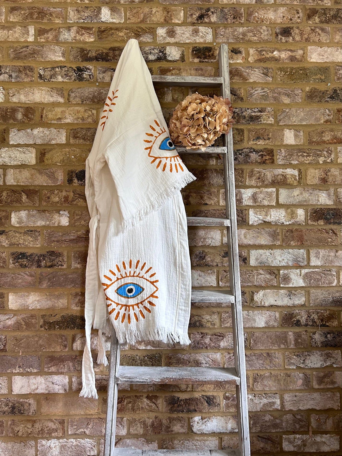 This gorgeous white kimono shortie, adorned with vibrant orange and blue evil eye motifs, is the perfect throw-on piece for sunshine-filled days and cosy evenings alike. Wear it effortlessly over swimwear at the beach or spa, style it at festivals, or enjoy it as a lightweight layer for relaxed moments at home.