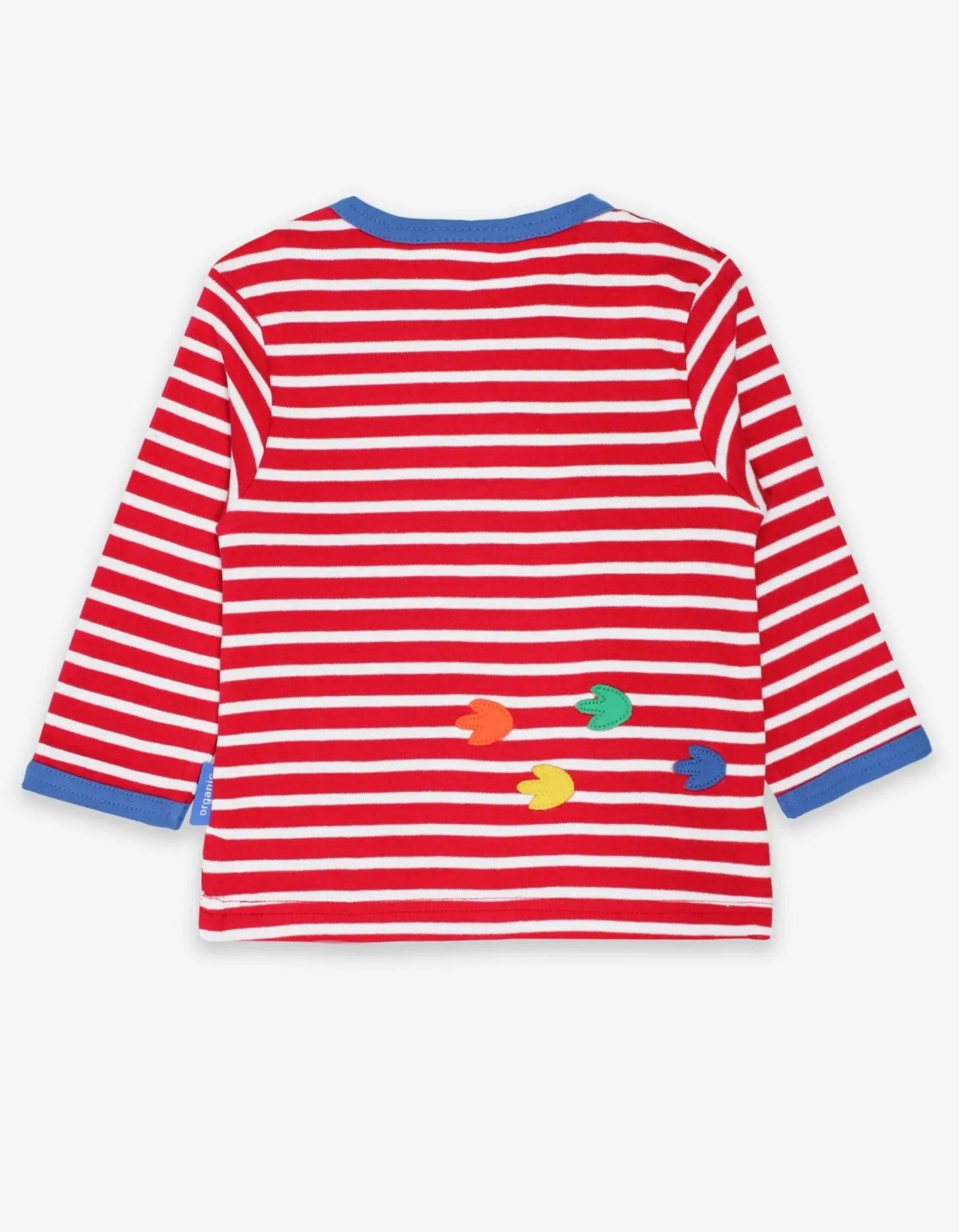 Here we have the lesser known multi-coloured triceratops. With her colourful horns and rainbow frill, she's happily tucking into her healthy plant-based treat. Talking of treats, this long-sleeved stripy organic cotton T-shirt will keep your little one feeling cosy and snug. Our smaller sizes have neck popper fastenings - you're welcome!