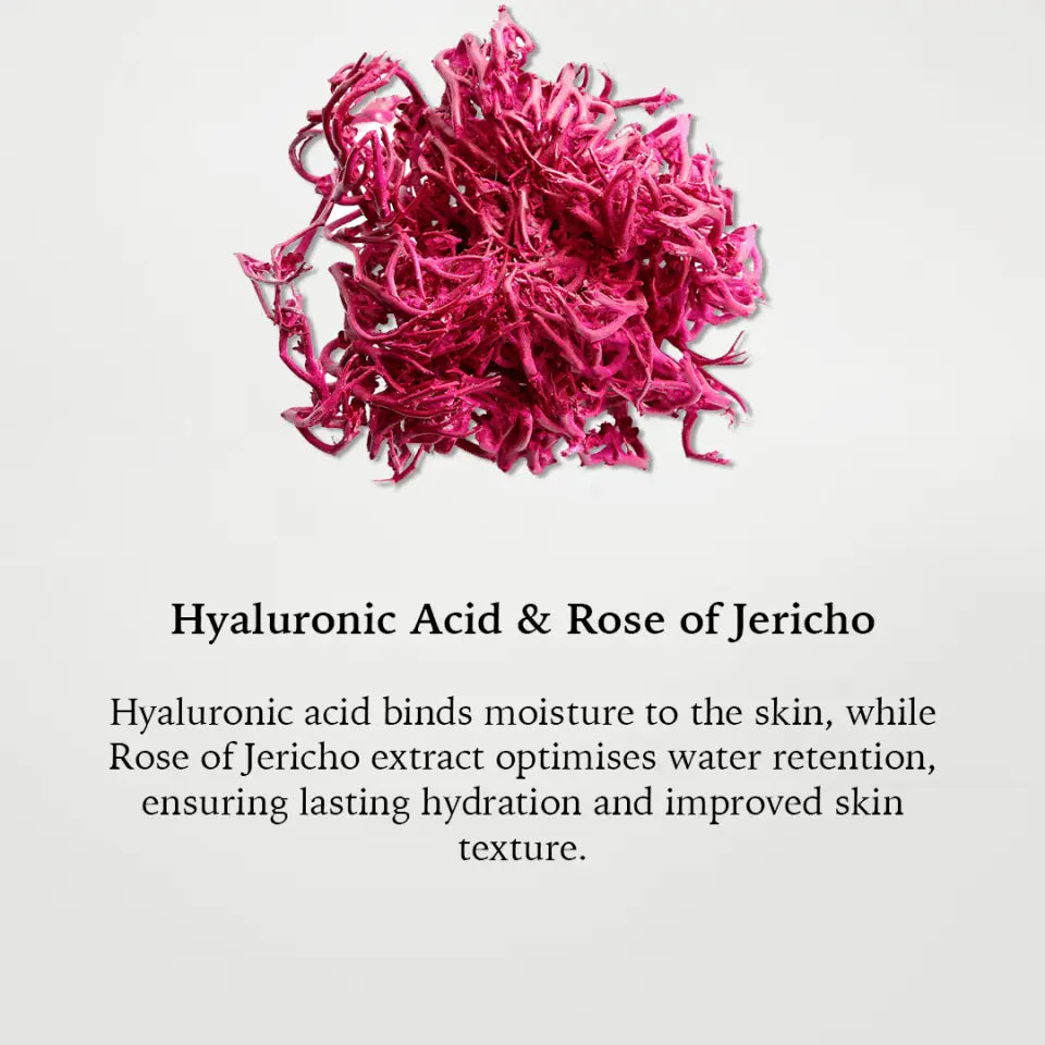 Frankincense, Myrrh and Bitter Orange help balance the skin by easing inflammation, while antioxidants Aloe Vera and Kale work to tackle premature ageing by decreasing the appearance of fine lines and rejuvenating the complexion. To bind the hydration to all skin layers for 24 hours, this formulation features Hyaluronic Acid, Tripeptides and the rare Rose of Jericho.