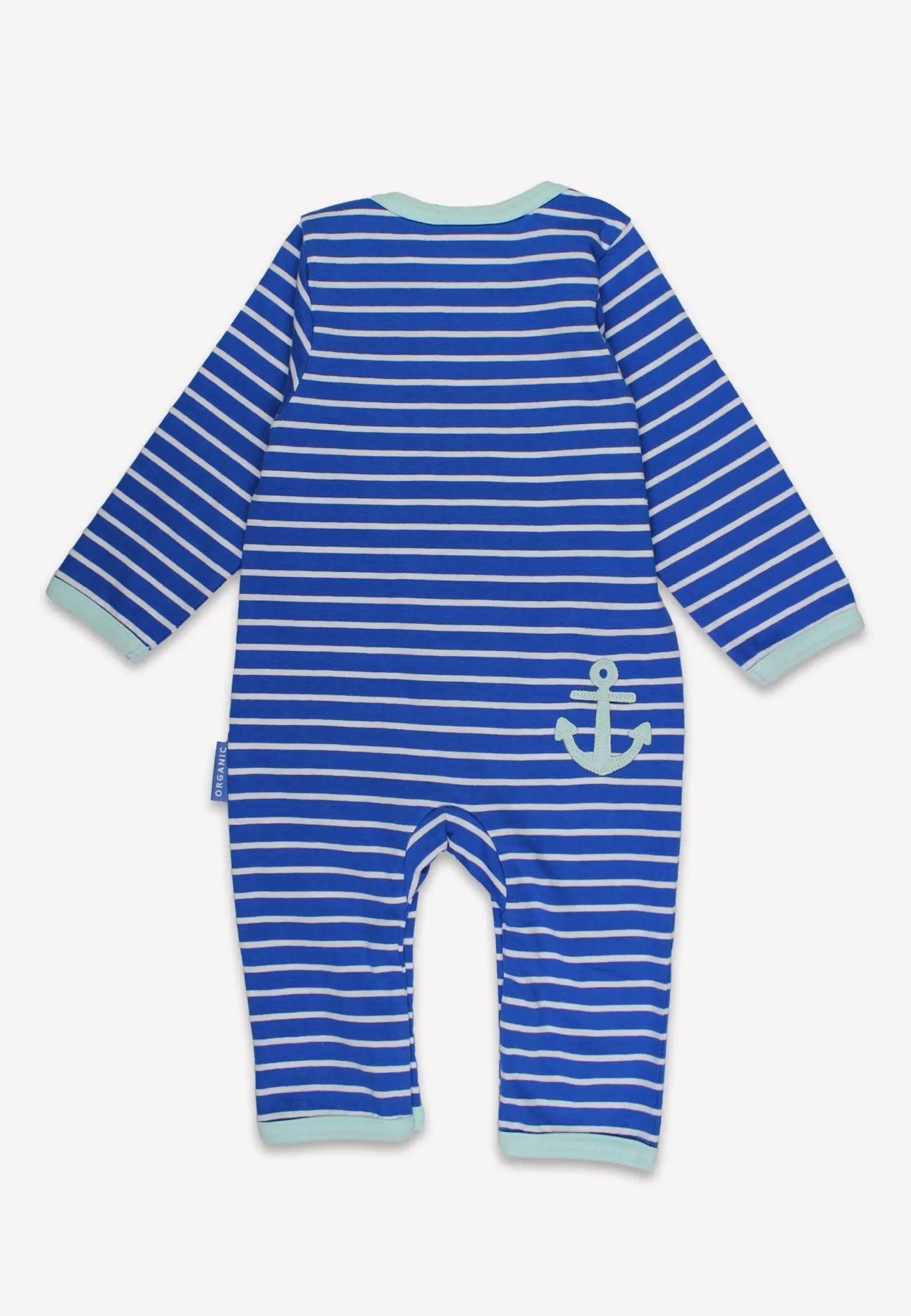 This blue and white striped footless sleepsuit is perfect for your little one! Made with 100% GOTS-certified organic cotton and environmentally friendly dyes, it features an adorable applique whale on the front and an anchor on the back. The envelope neckline and popper fastenings make it easy to take on and off. Machine washable for convenience.