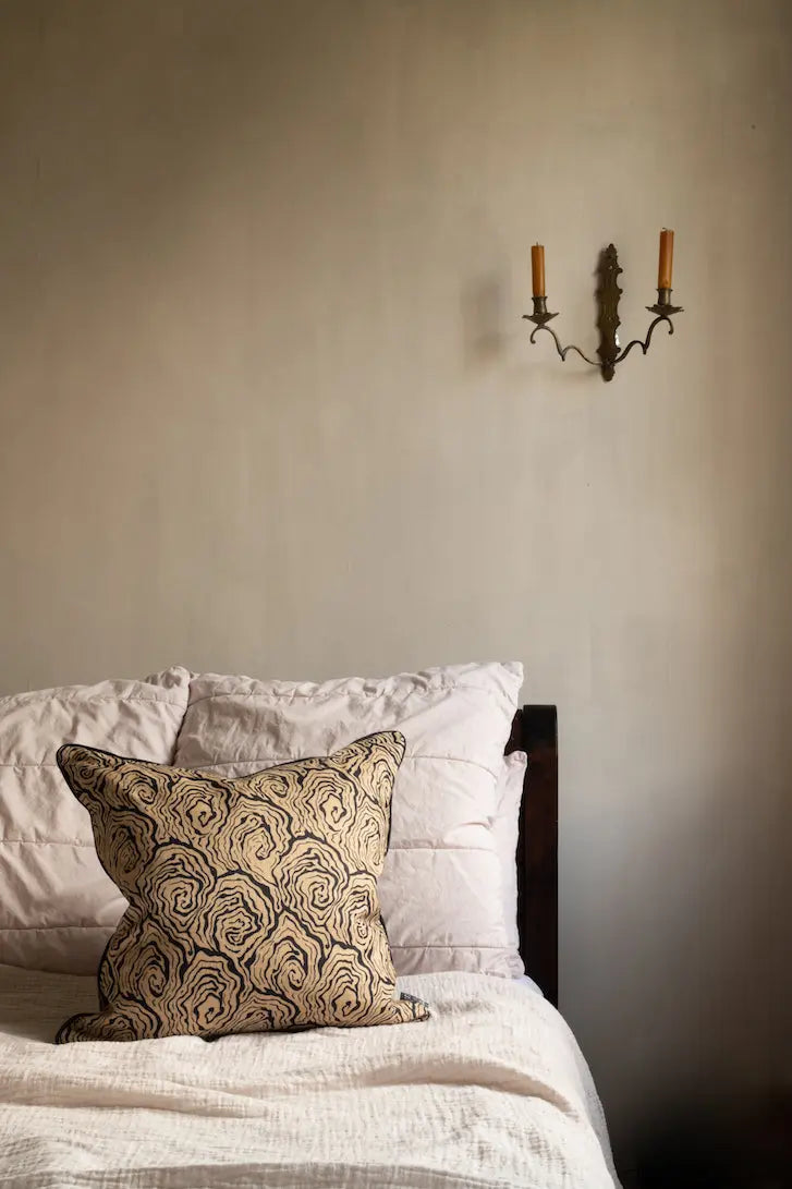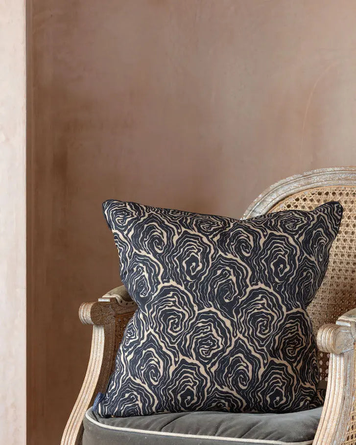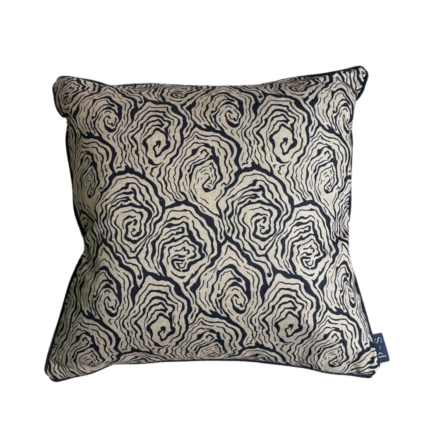 Multifunctional double sided cream and black linen cushion with black pipping.