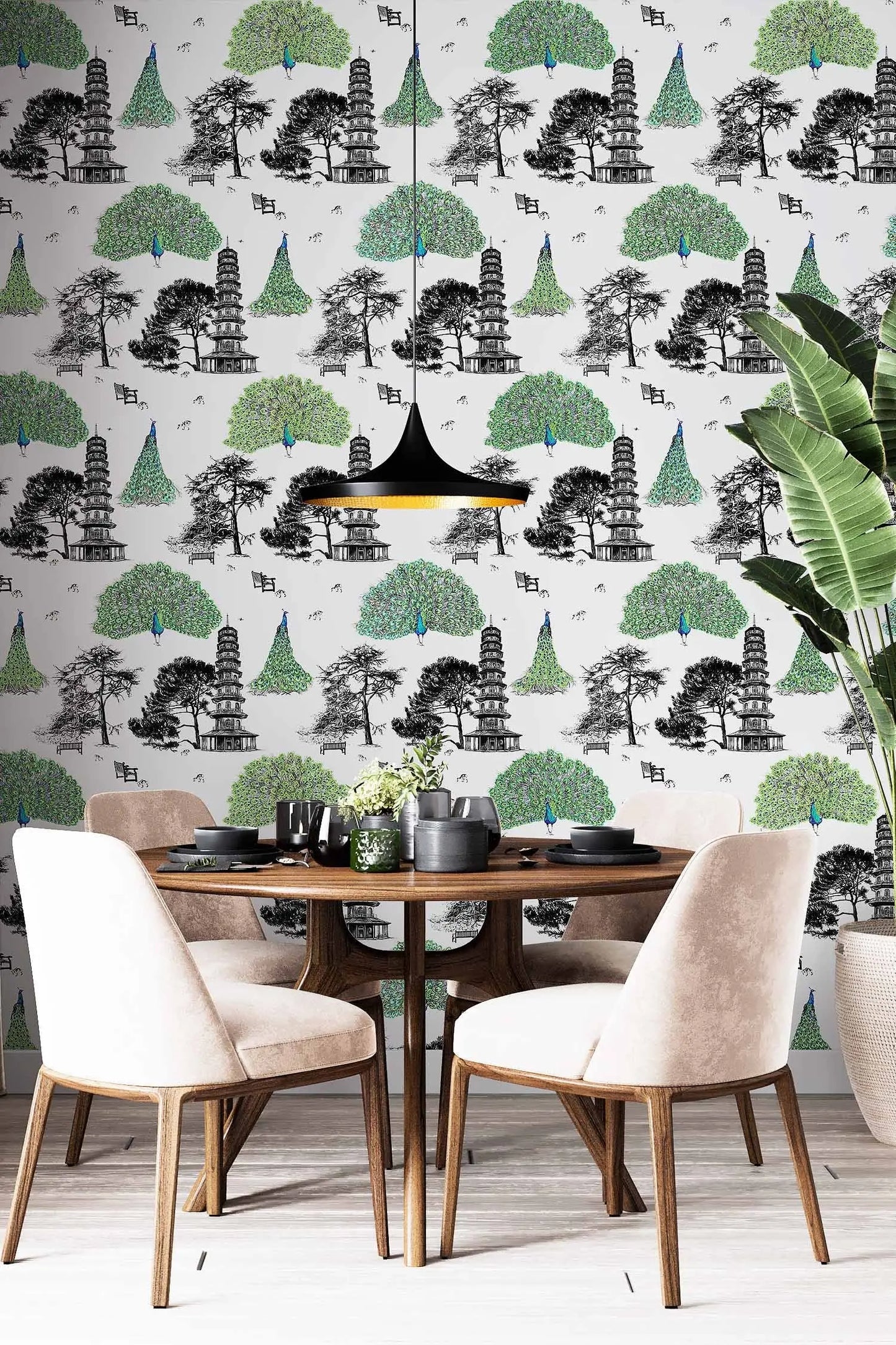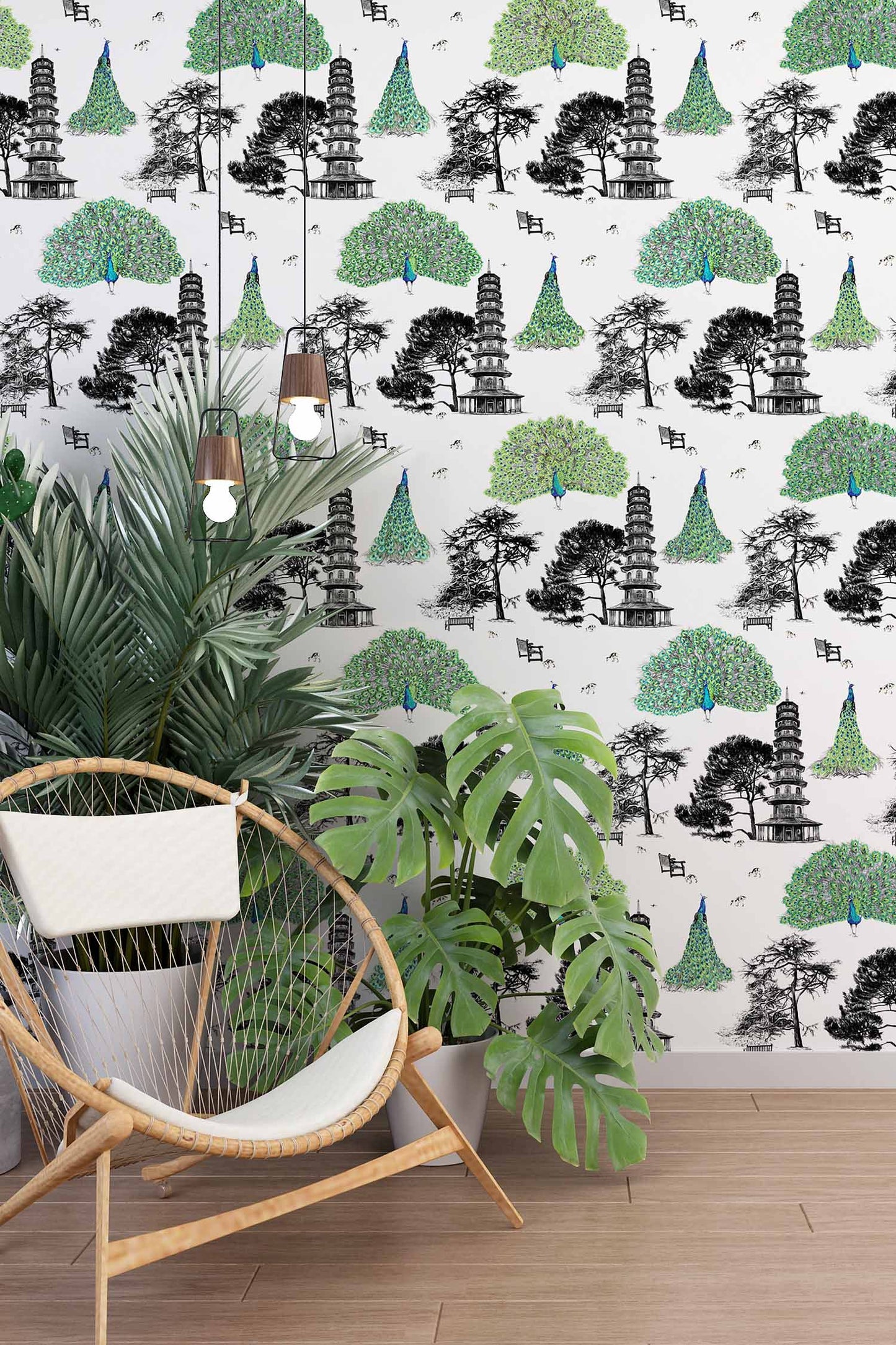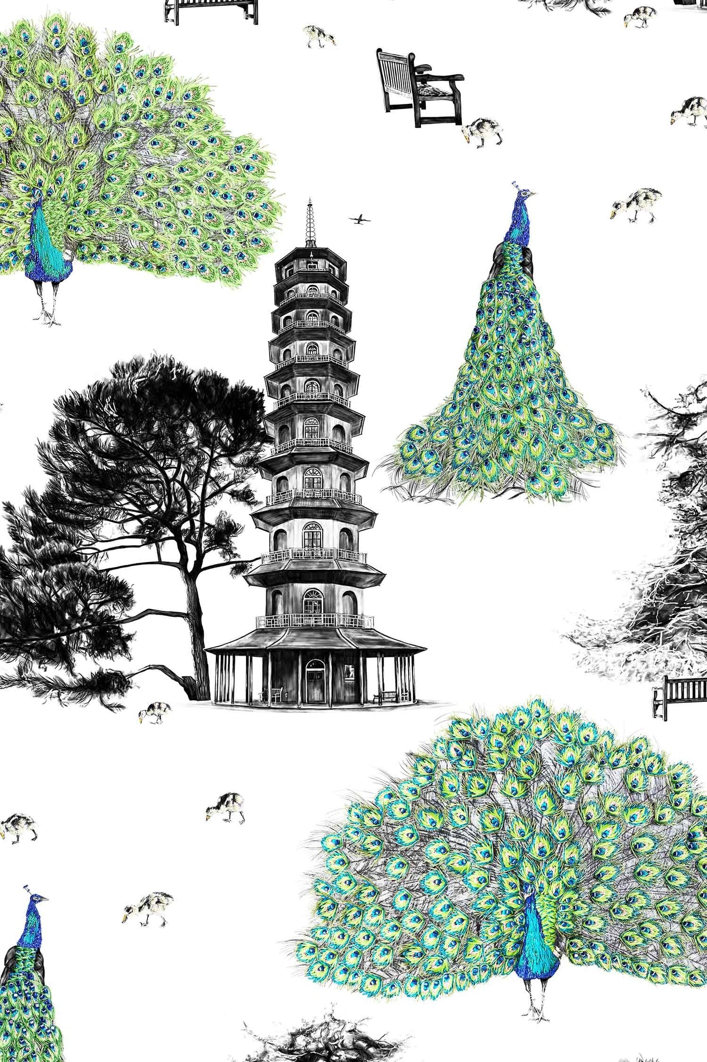This peacock wallpaper is authentically reproduced from hand-drawn artwork, embroidery and beading.