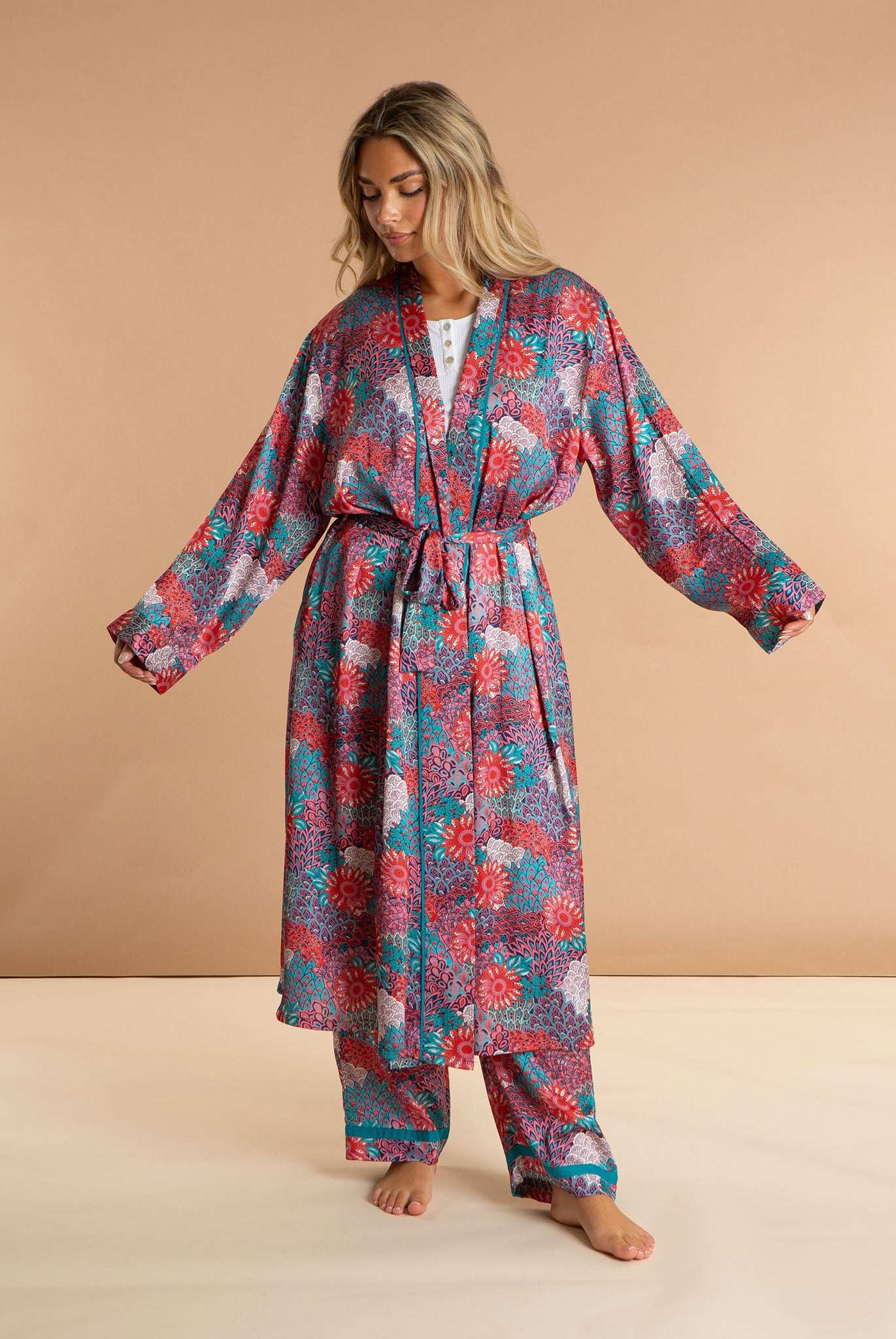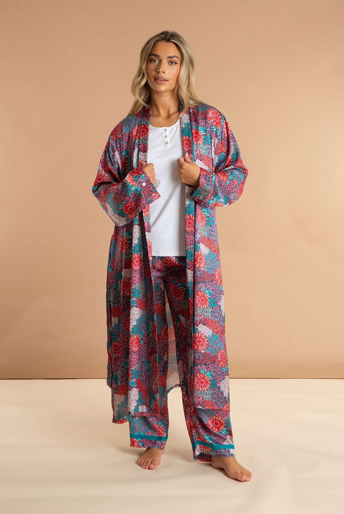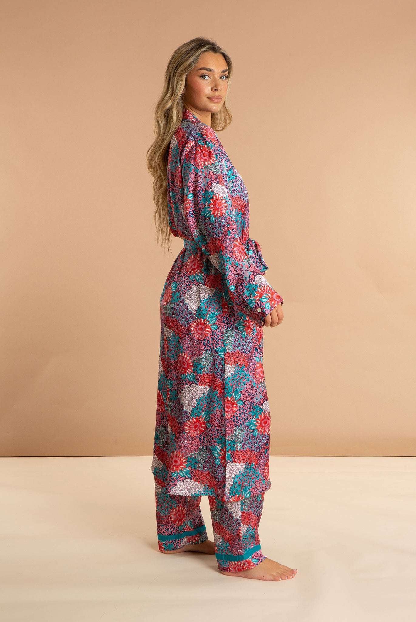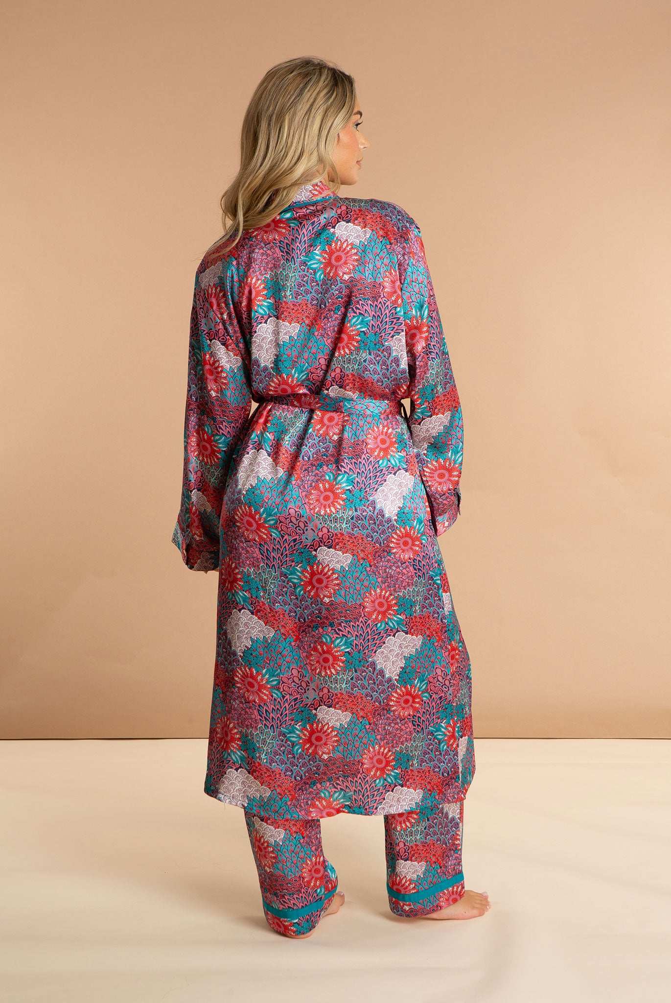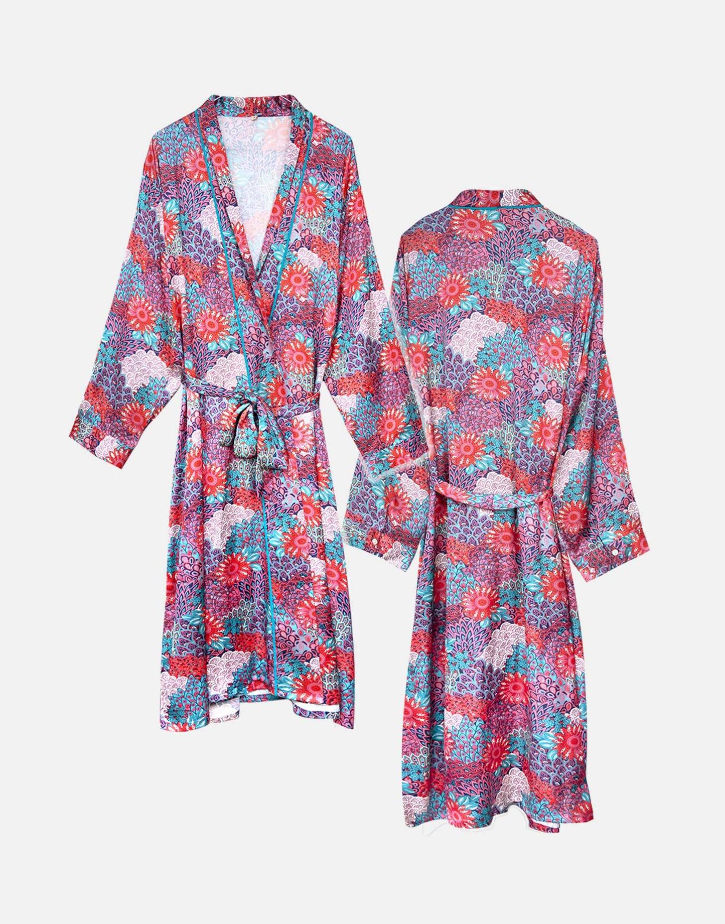 Our Peacock women's satin robe is a retro twist on the national bird of India. Featuring a long length and an inner drawstring for security, this luxury dressing gown is made from 100% polyester. Our comfortable, bold printed loungewear puts you in a restful state of mind.