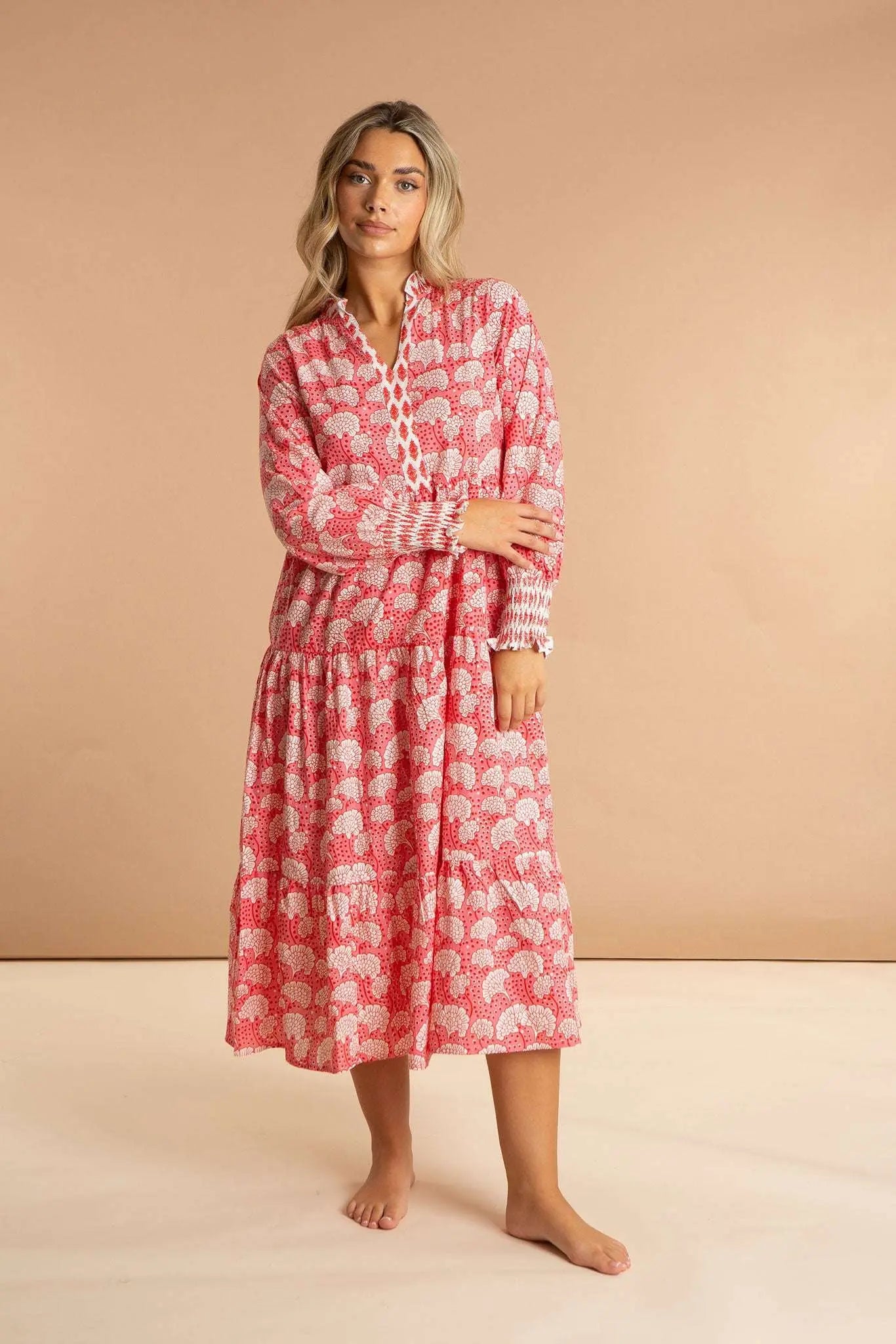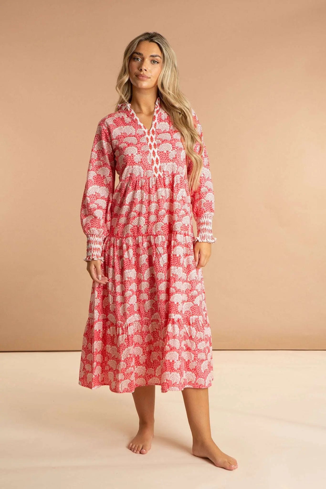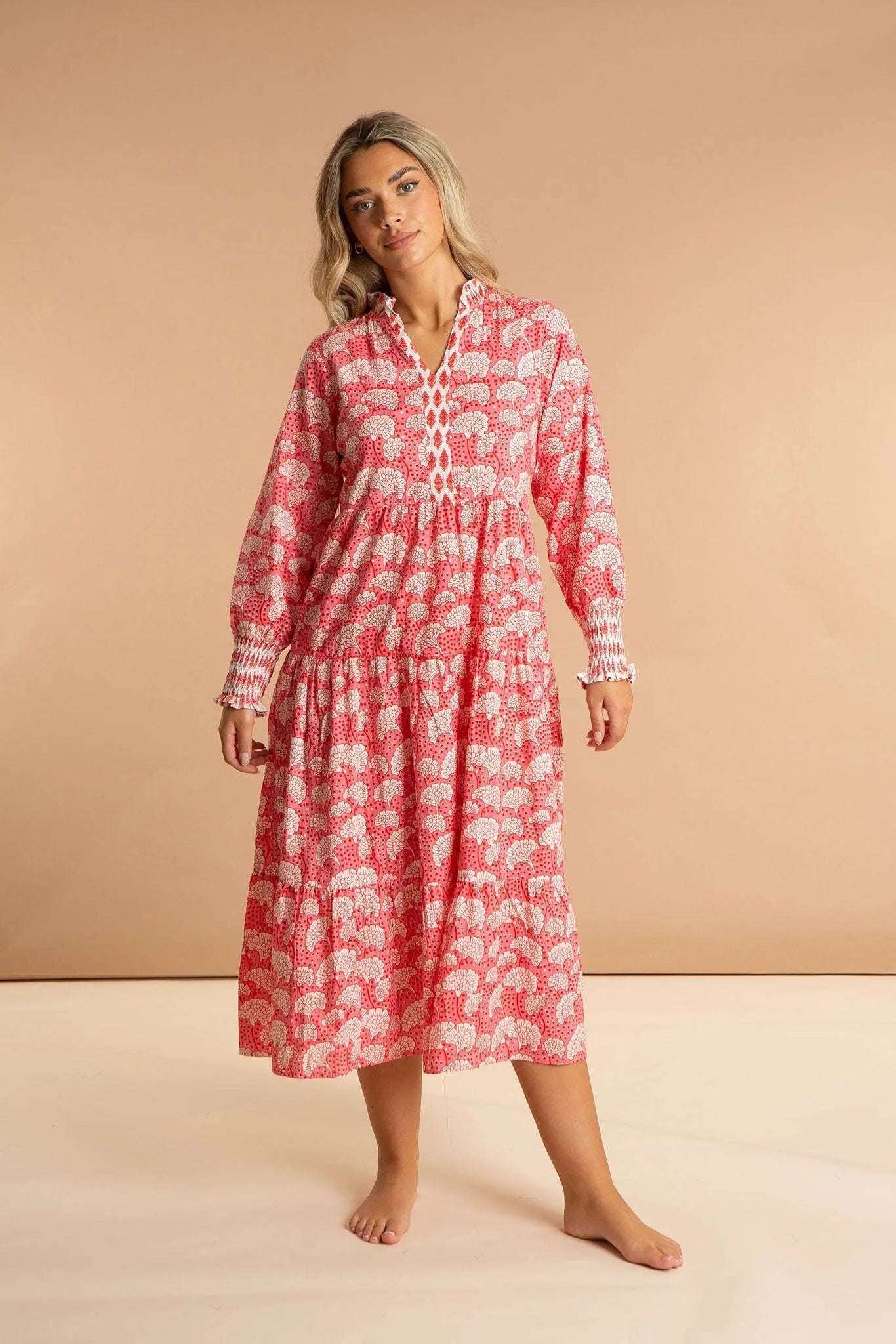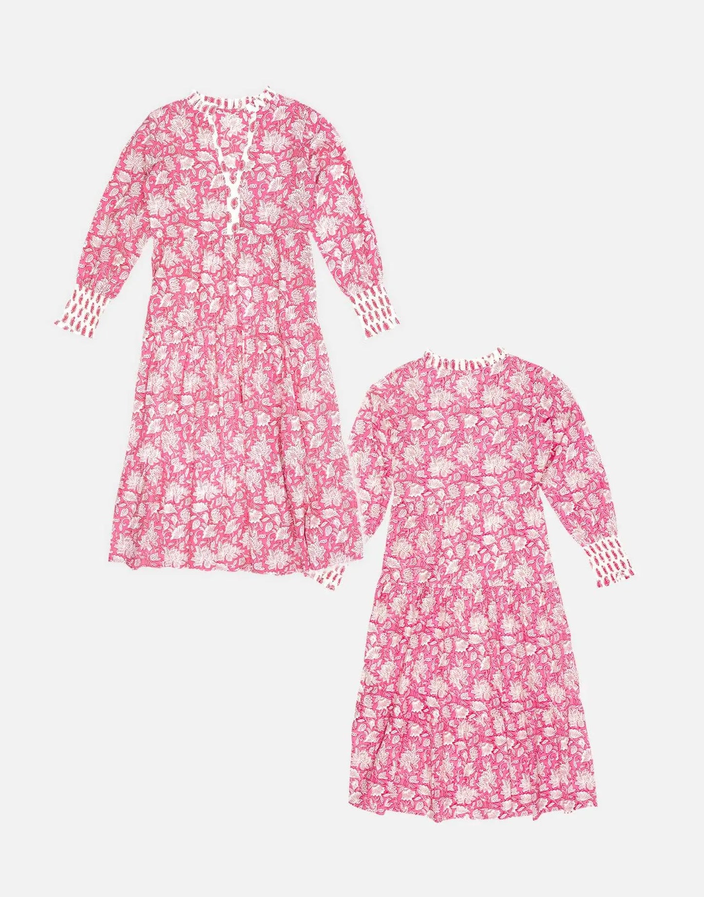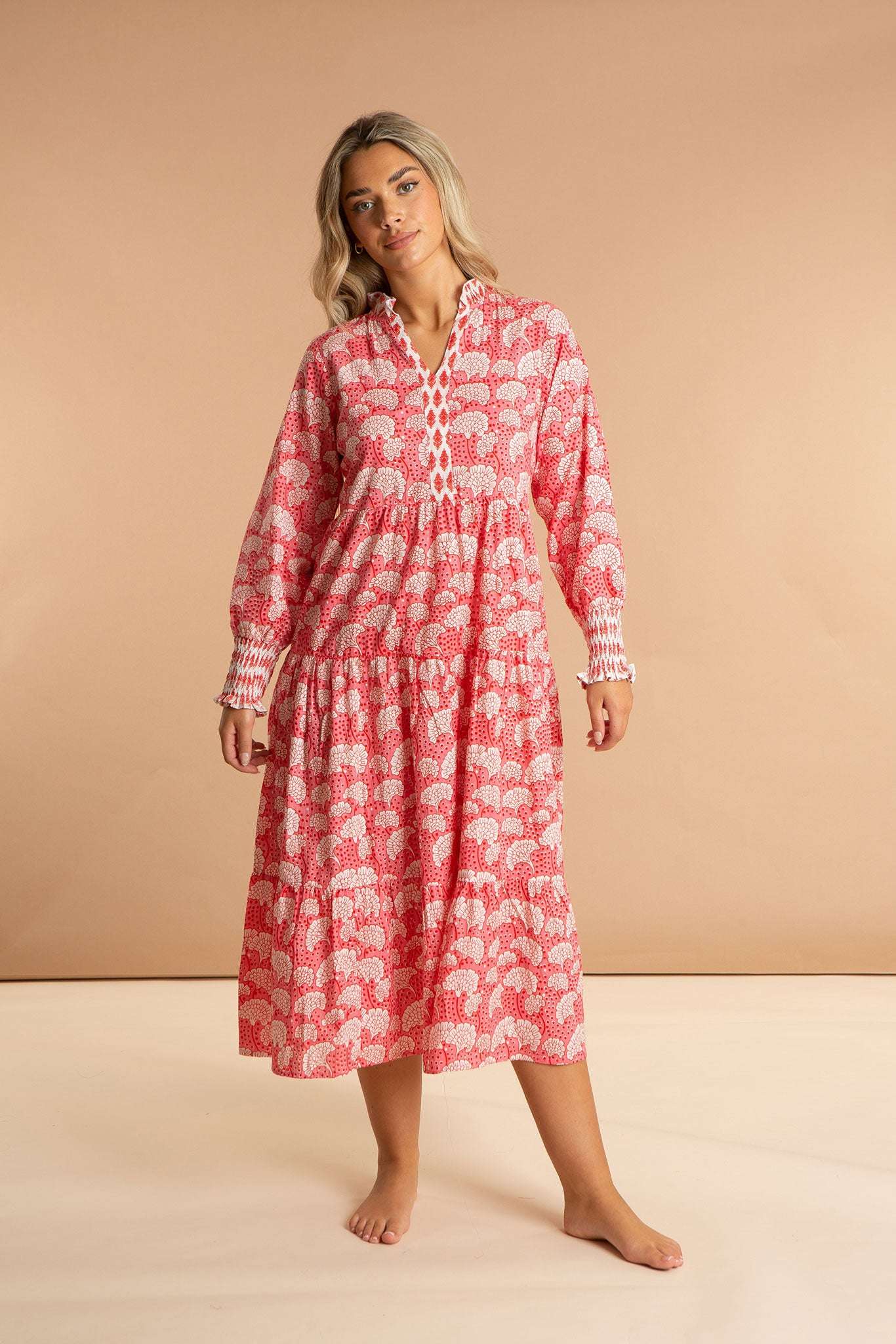 Our Peony Paisley women's cotton dress is inspired by the floral origins of Kashmiri shawls. Featuring a full midi length skirt, contrast neckline, long sleeves, and a flattering V-neckline with a short collar, this luxury pink dress is made from soft and breathable 100% Indian cotton. Show off your girly side in this pink and white printed flowy summer dress.