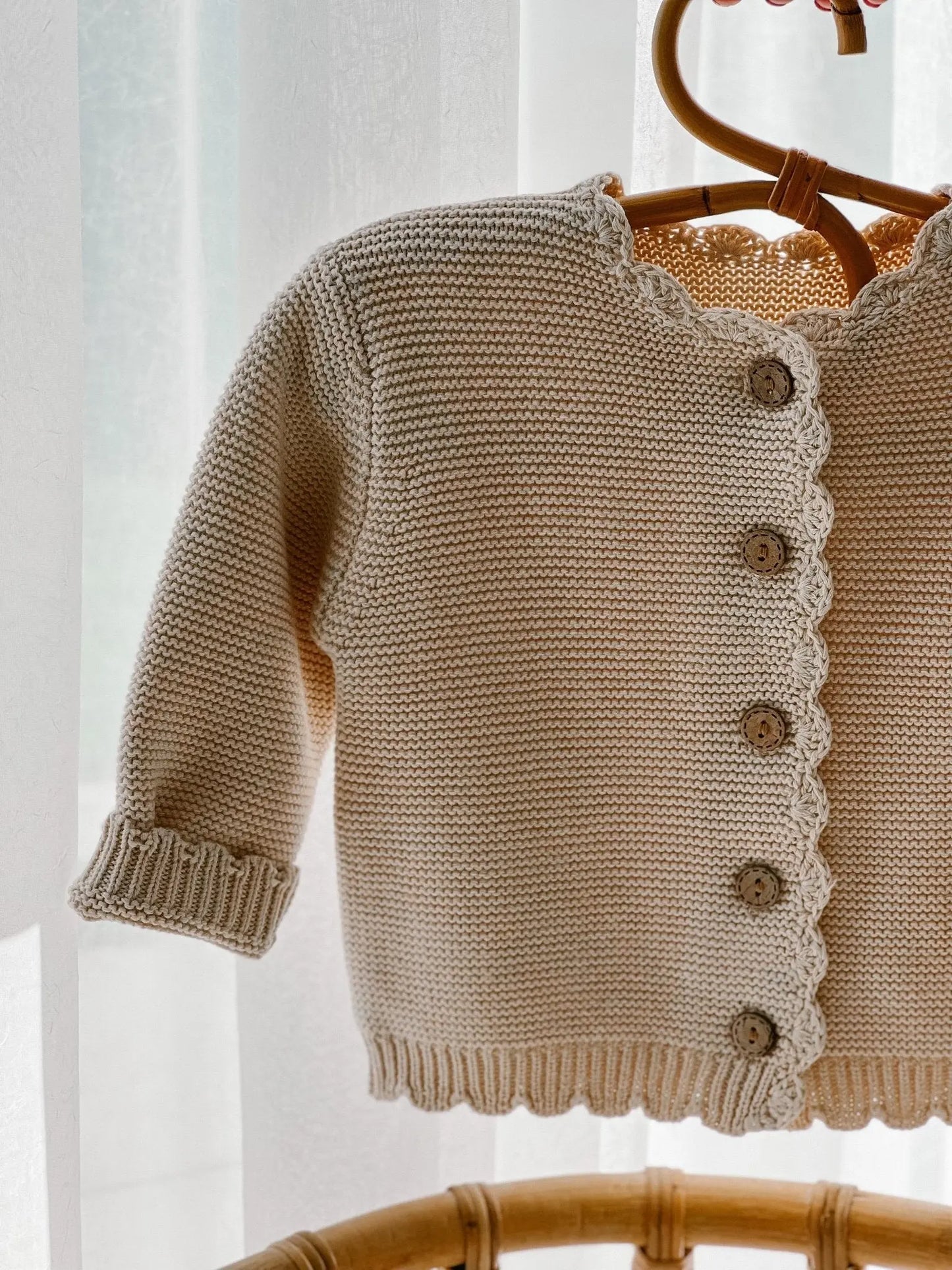 Knitted from 100% premium cotton and hand-embroidered in the UK. Available in three beautiful colours: Oat, Chocolate and Sage Green. Each cardigan is embroidered with your chosen name on the back, using your preferred thread colour. Please see the thread colour chart in the photos for all available options.
