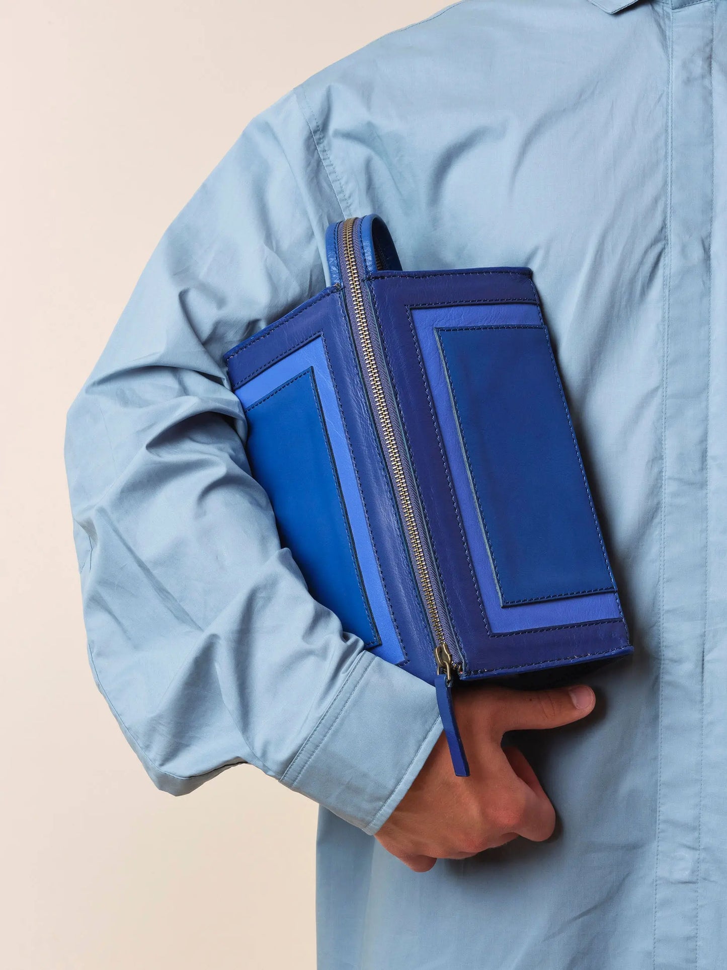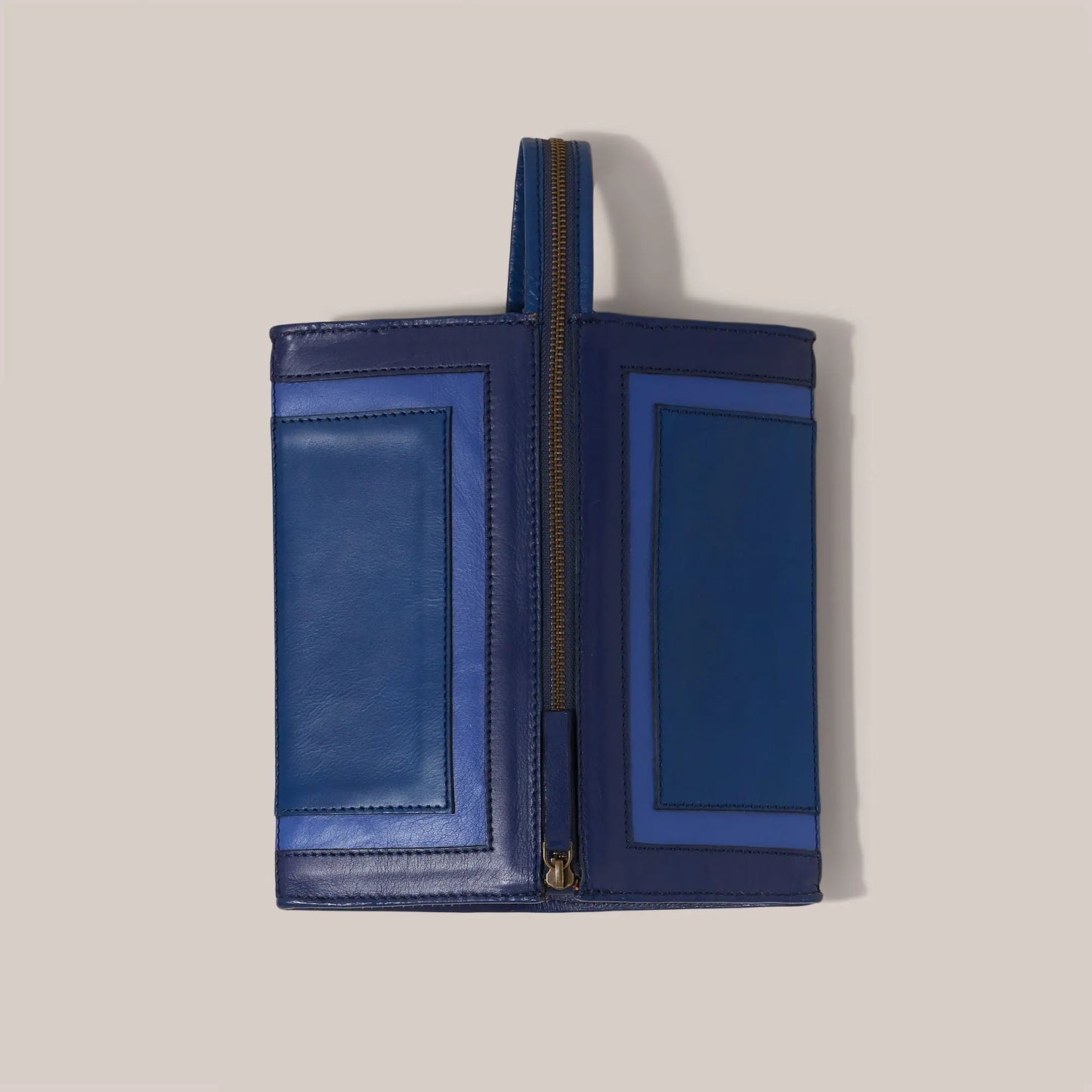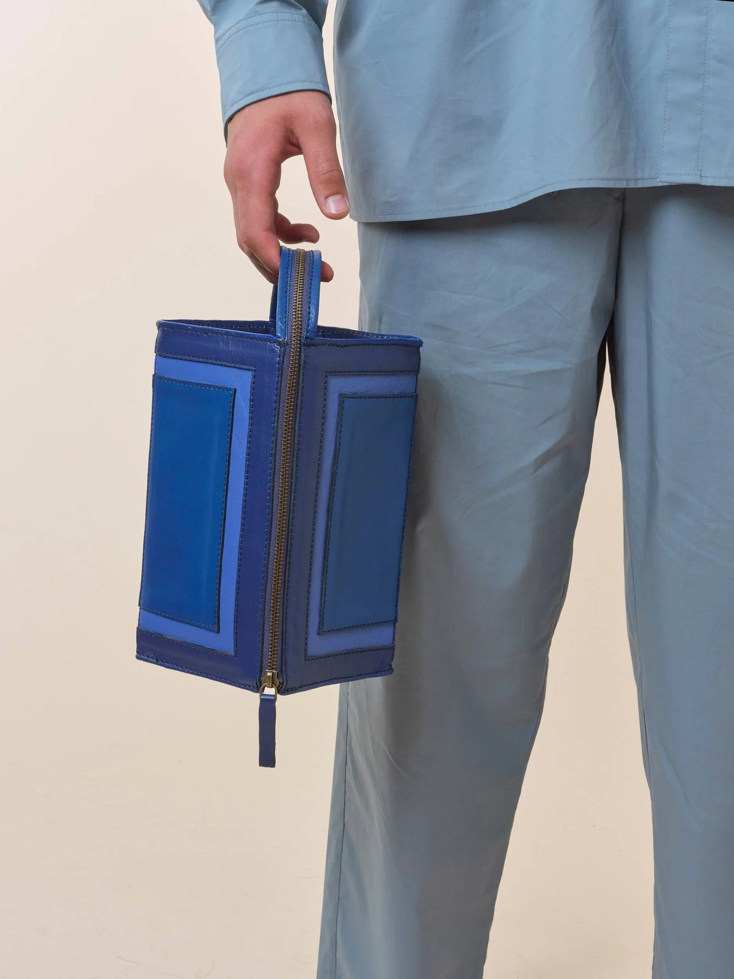 Crafted from hand-dyed navy matte leather with a contrasting cornflower blue canvas lining, it blends craftsmanship with everyday function. Patient tested and clinician approved, this elegant travel pouch brings together practicality, comfort, and quiet luxury-making it a reassuring companion throughout your care journey.