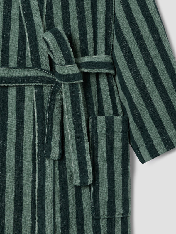 Woven from 400gsm cotton, this robe is naturally absorbent, beautifully soft, and invitingly warm. Designed with handy side pockets, an adjustable waist tie, and kimono-inspired sleeves, it combines laid-back luxury with everyday functionality. The rich Pine Green stripe brings a calm, earthy elegance to your downtime.