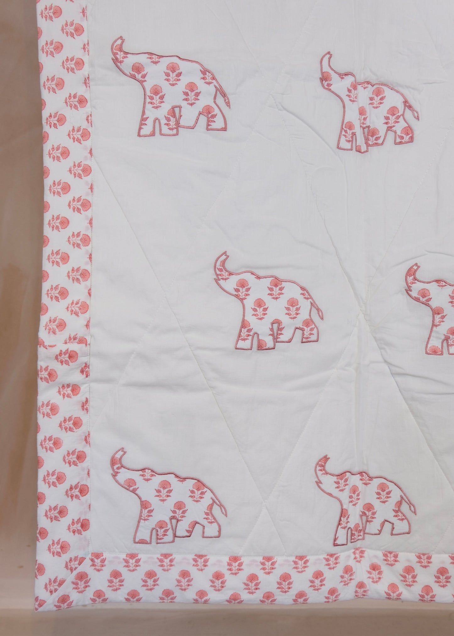 Our new cot quilts make the sweetest gift for newborns or baby’s. They are made of a very soft organic cotton and have appliquéd block print elephants on one side and solid block print on the other. They can be used both in the cot, as a play mat in the nursery or a pram blanket.