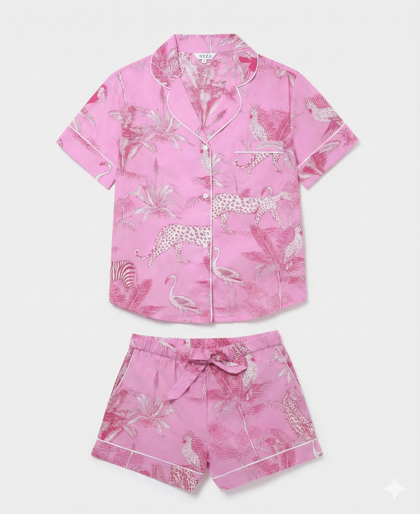 Pink Jungle Organic Cotton Pyjama Short Set – Bring the Wild to Your Wardrobe with a Bold Jungle Print