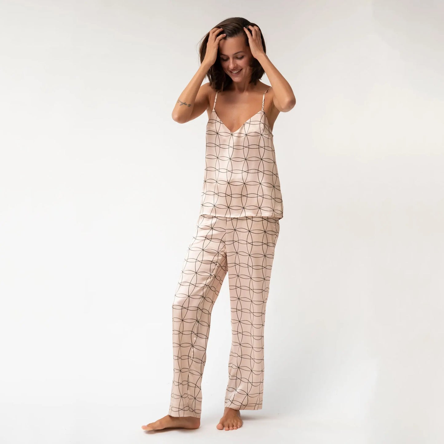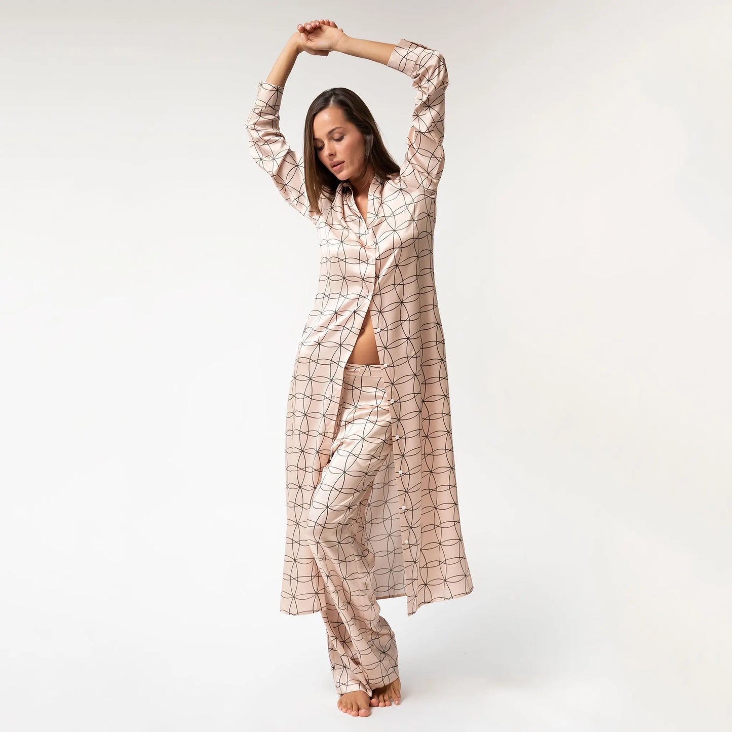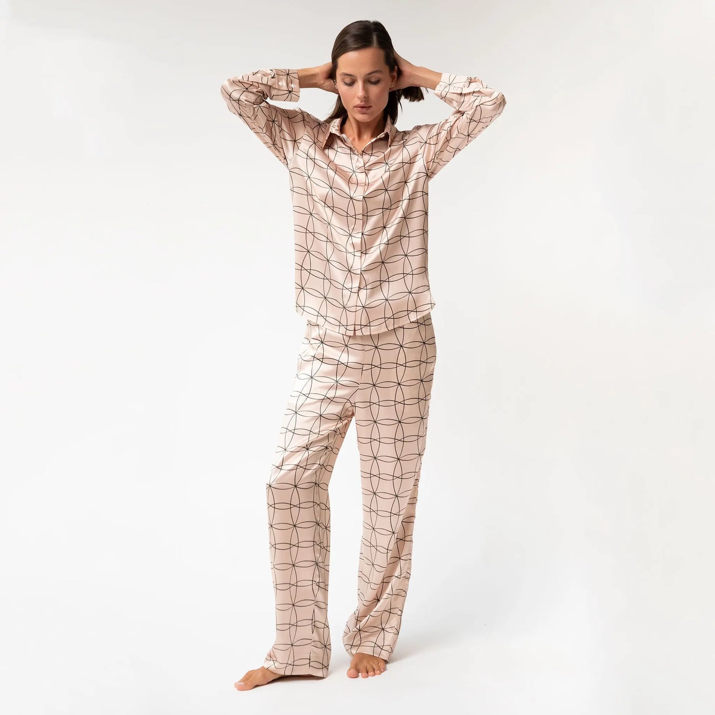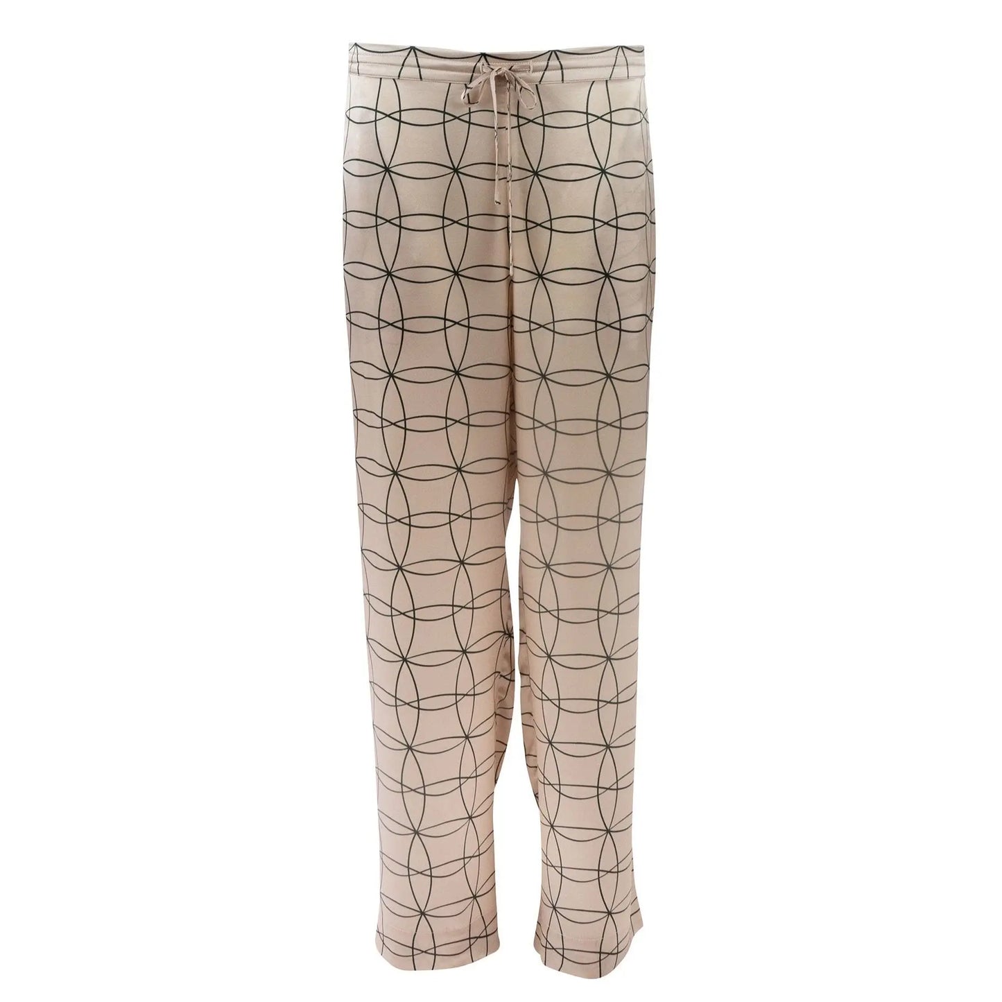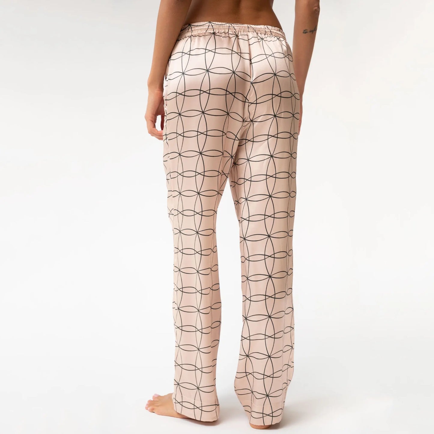 With a soft transcendent pink background and a striking black geometric pattern, the Neo Geo pants are designed with an in-and-out aesthetic. This versatile design allows for a stylish and elegant look, perfect for lounging in the bedroom, casual outings, or even a day at the office.