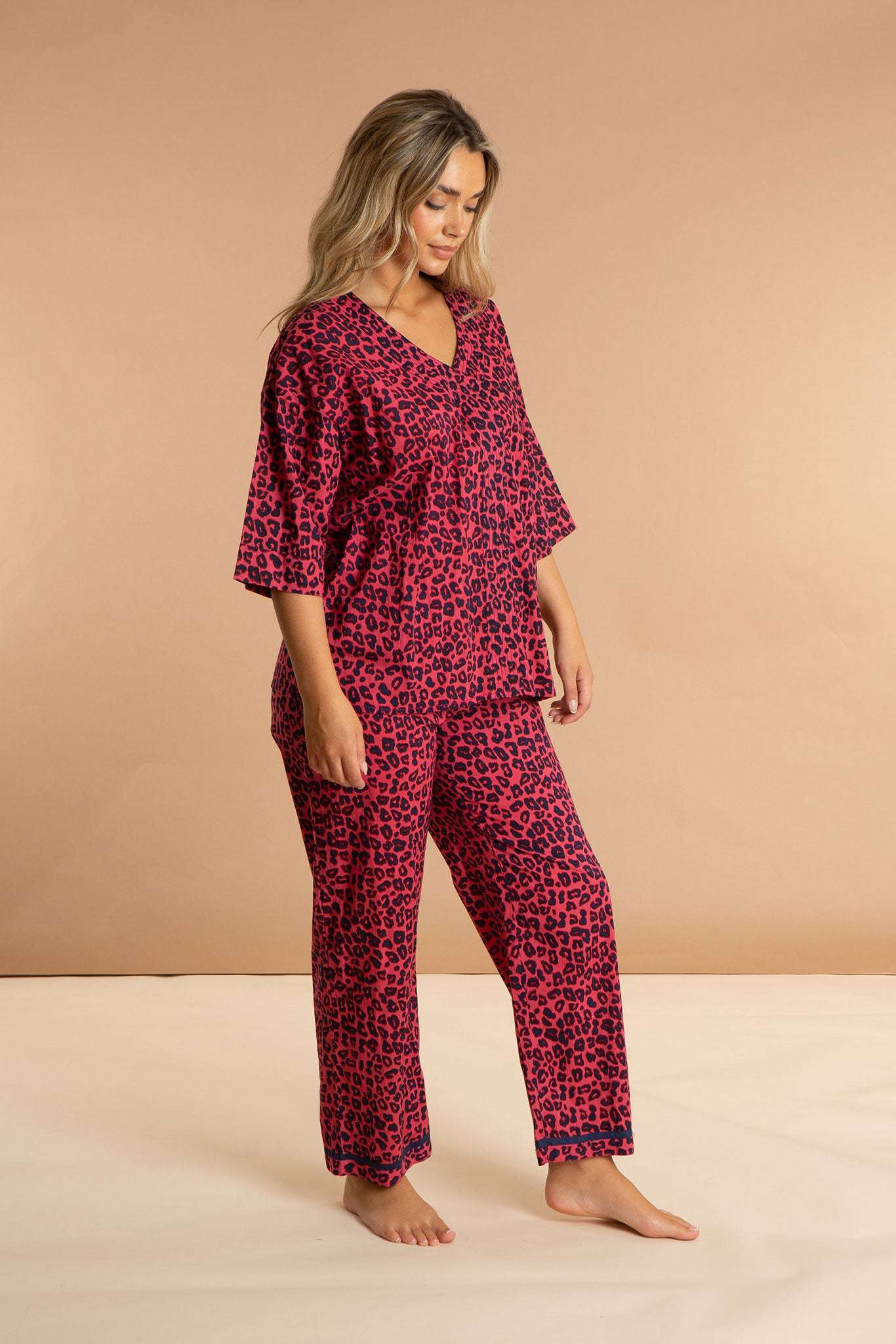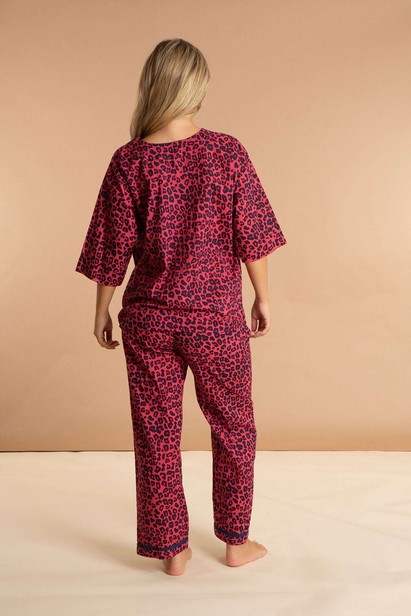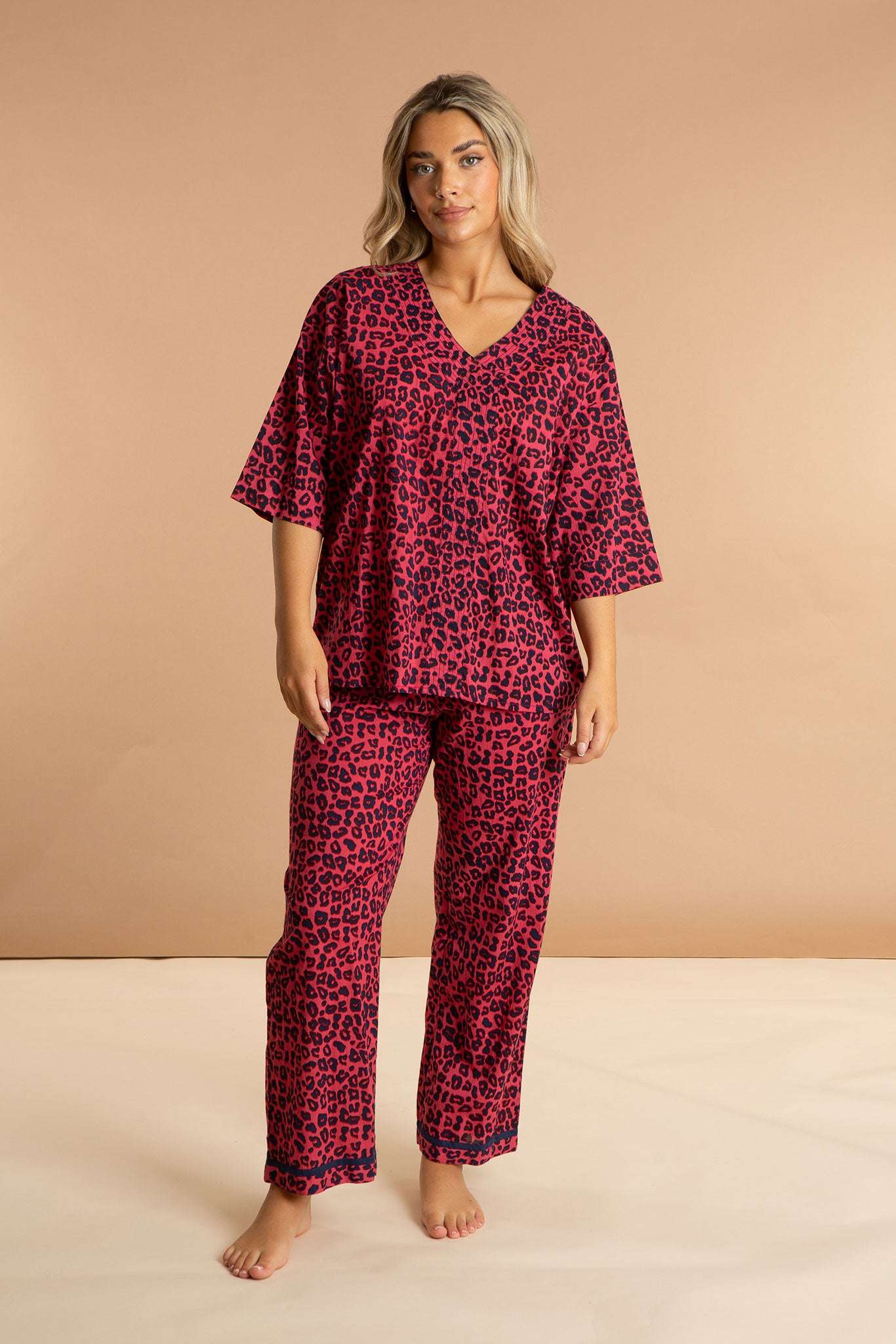 Our Pink Panther women's cotton pyjamas set is inspired by feline friends in fuchsia sunsets. These luxury pjs feature an elbow-length sleeved loose top with an open V-neckline and straight leg pyjama bottoms, both featuring a bold fuchsia leopard print pattern. The pink and navy fabric is carefully printed and pre-washed, leaving the 100% Indian cotton purrfectly soft.
