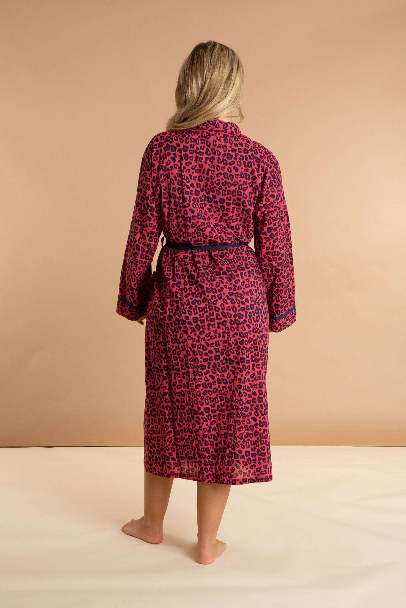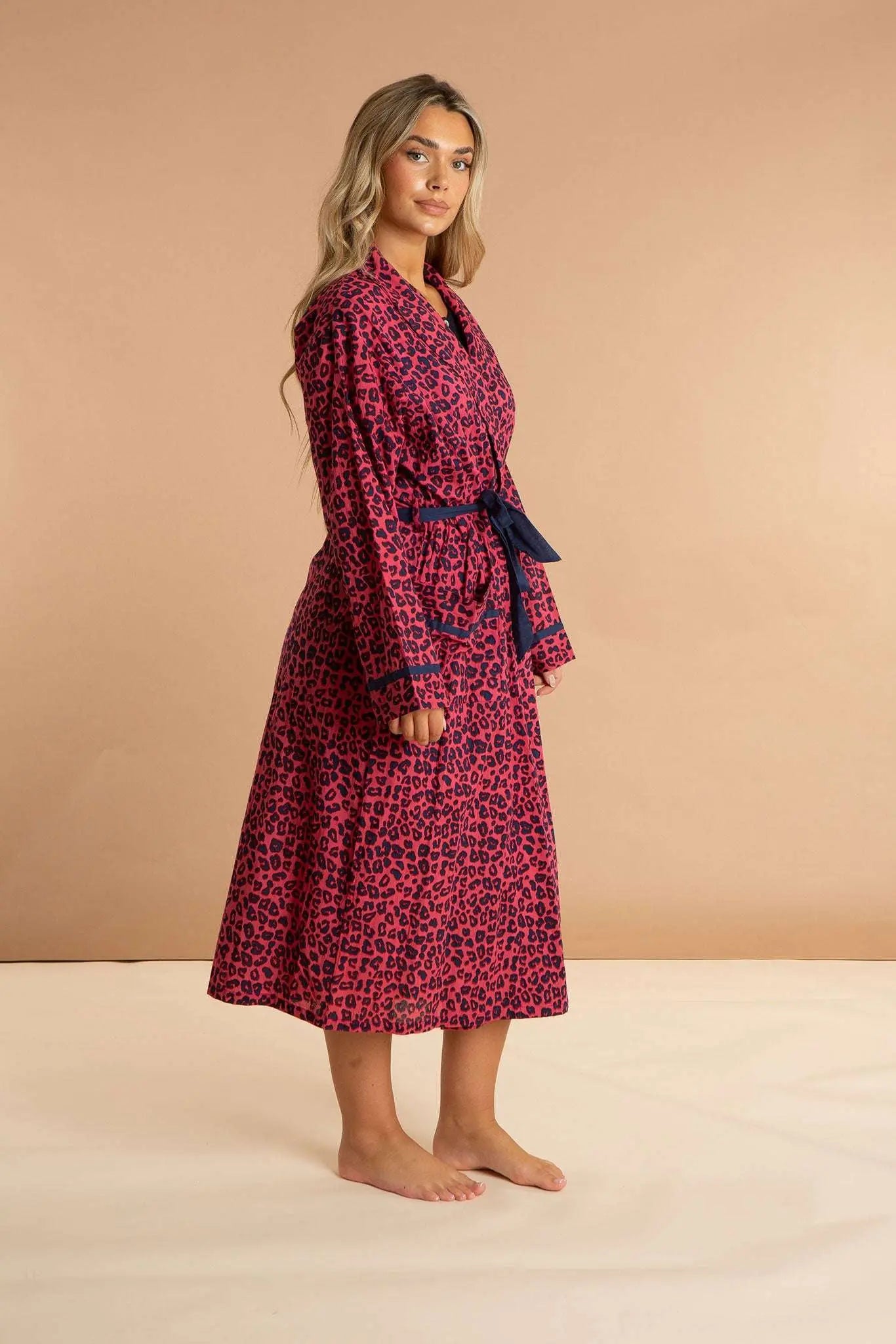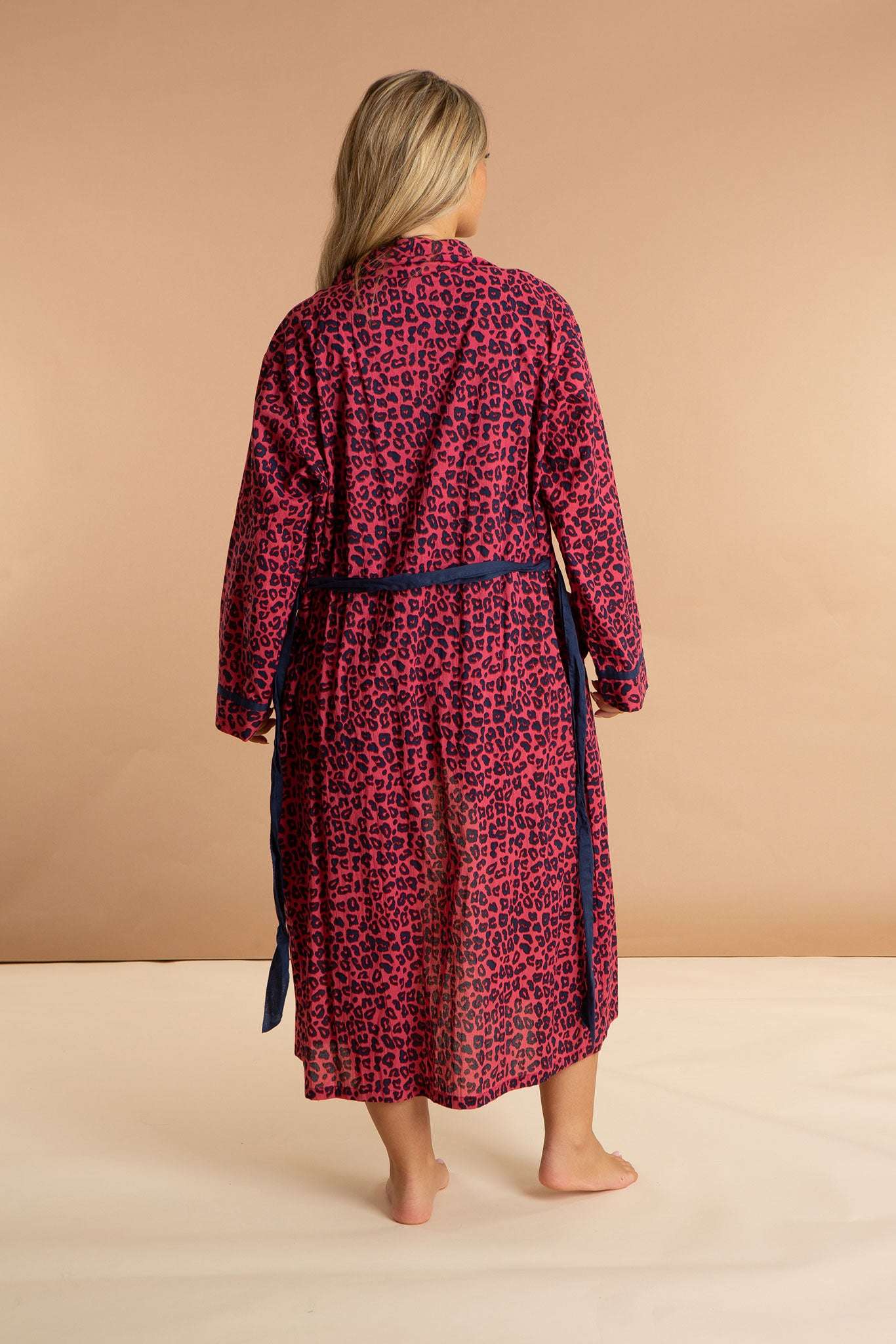 Our Pink Panther women's cotton robe has a pattern inspired by feline friends in fuchsia sunsets. Featuring deep pockets, contrast navy details, and an inner drawstring for security, this luxury dressing gown is made from soft and breathable 100% Indian cotton. The pink animal print pattern will embolden you to wear this long robe at home, on the beach, and beyond.