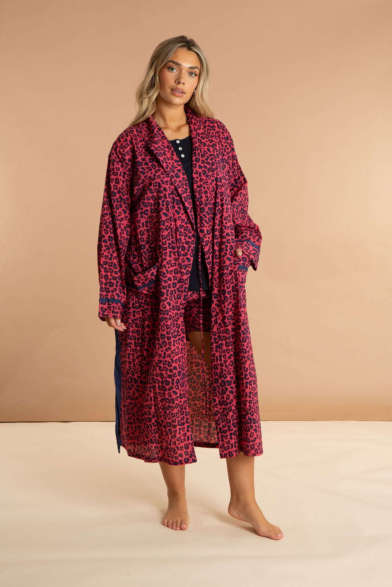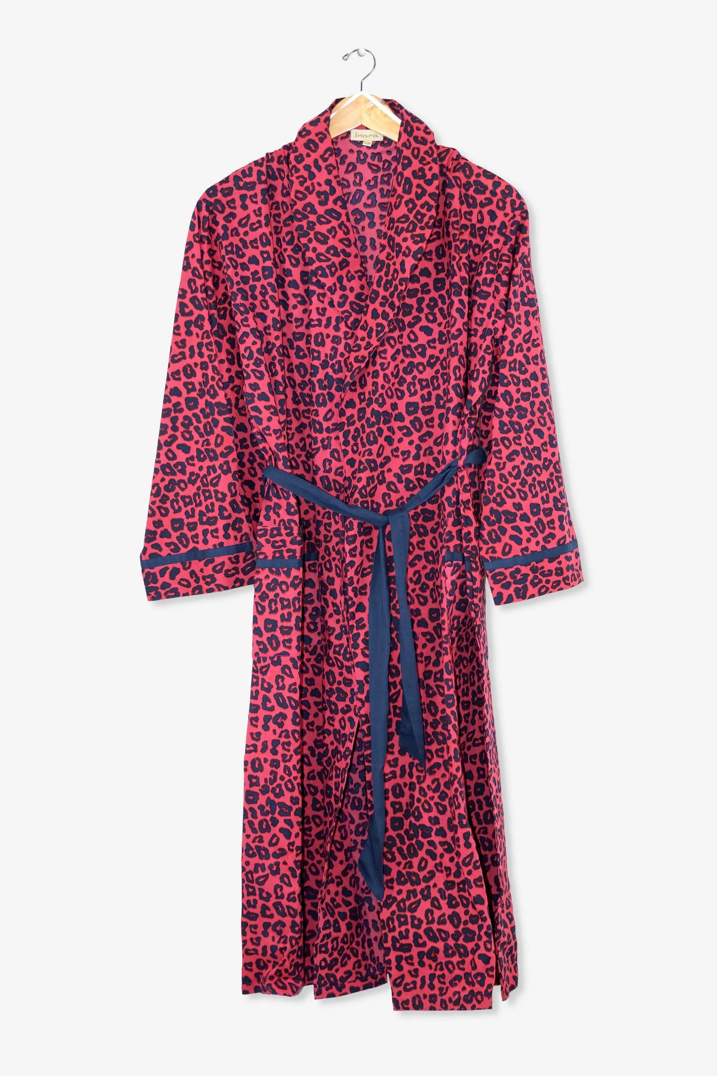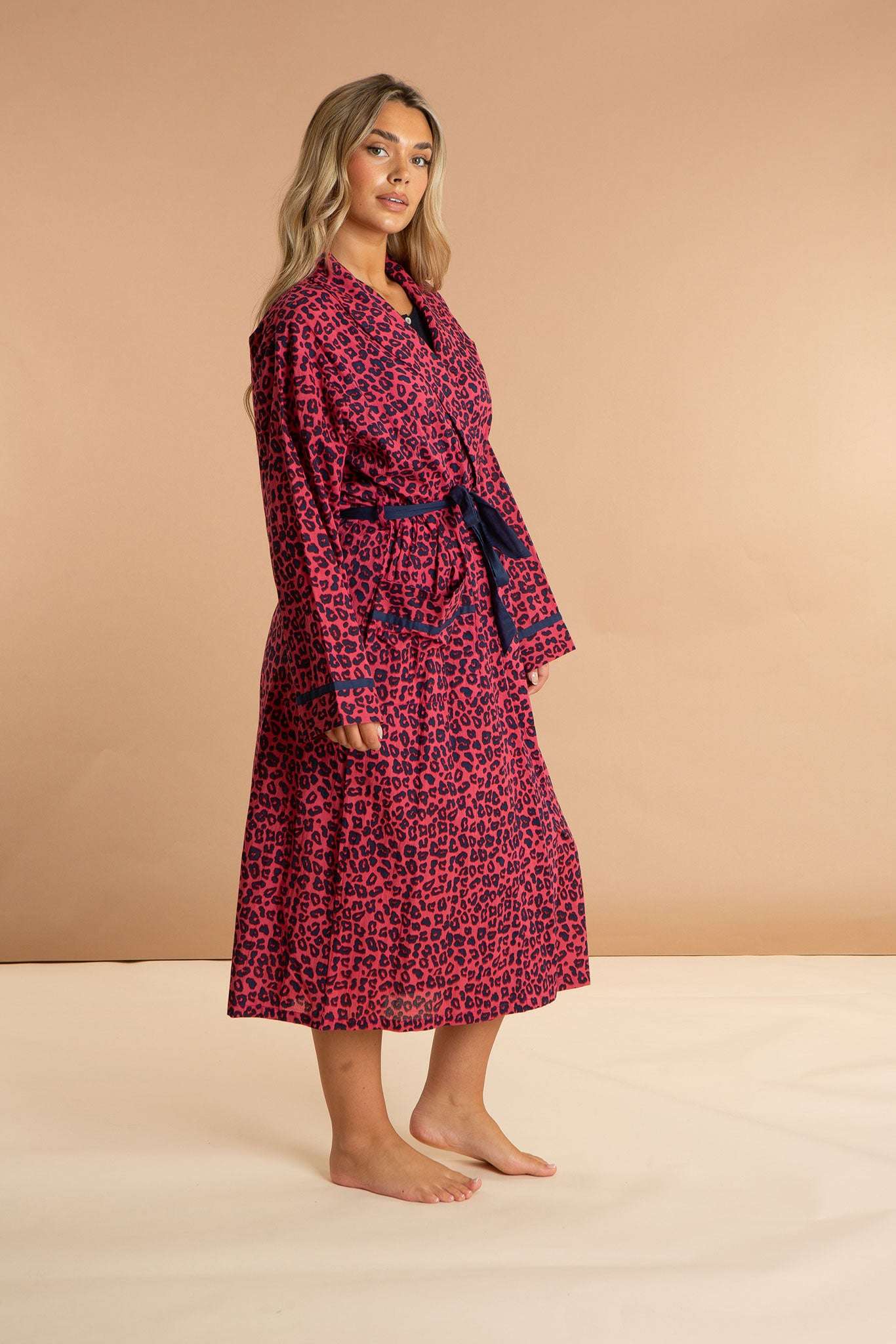 Our Pink Panther women's cotton robe has a pattern inspired by feline friends in fuchsia sunsets. Featuring deep pockets, contrast navy details, and an inner drawstring for security, this luxury dressing gown is made from soft and breathable 100% Indian cotton. The pink animal print pattern will embolden you to wear this long robe at home, on the beach, and beyond.