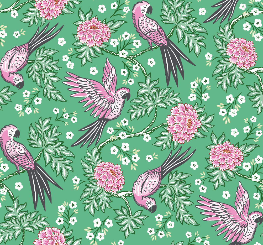 - Playful Pink Parrots on Green print that makes a bold, exotic statement