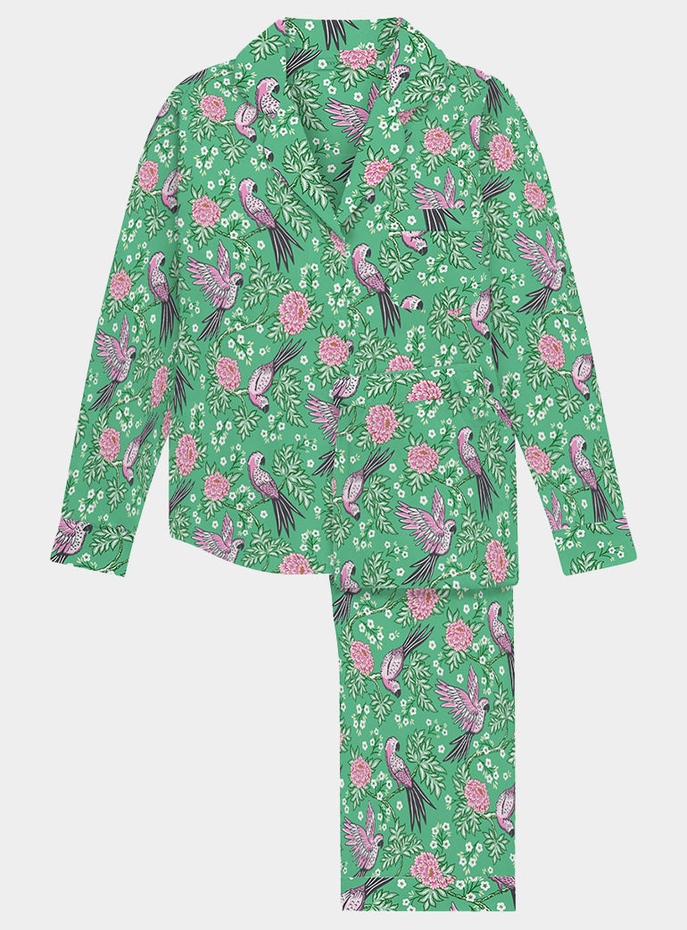 Add a touch of tropical glamour to your evenings and mornings with this Pink Parrots on Green print pyjama trouser set. Designed with sleek contrast piping for elevated detailing, the smooth recycled-polyester satin fabric drapes beautifully, offering luxurious comfort and sustainable style.