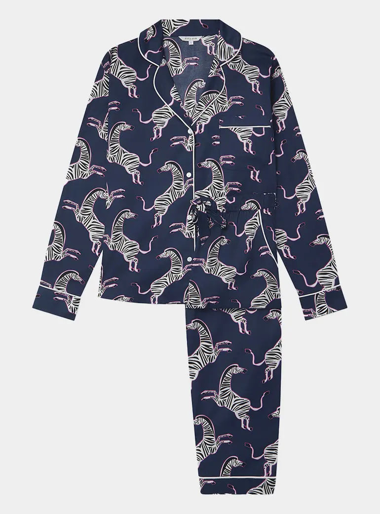 Designed to feel both classic and contemporary, and cut for a relaxed yet tailored fit, this zebra 100% organic GOTS certified cotton pyjama set will brighten your nights and mornings with its vibrant all-over print. With contrast piped trims throughout, the bottoms come with handy slip pockets at sides and a drawstring elasticated waistband with fabric self-tie.