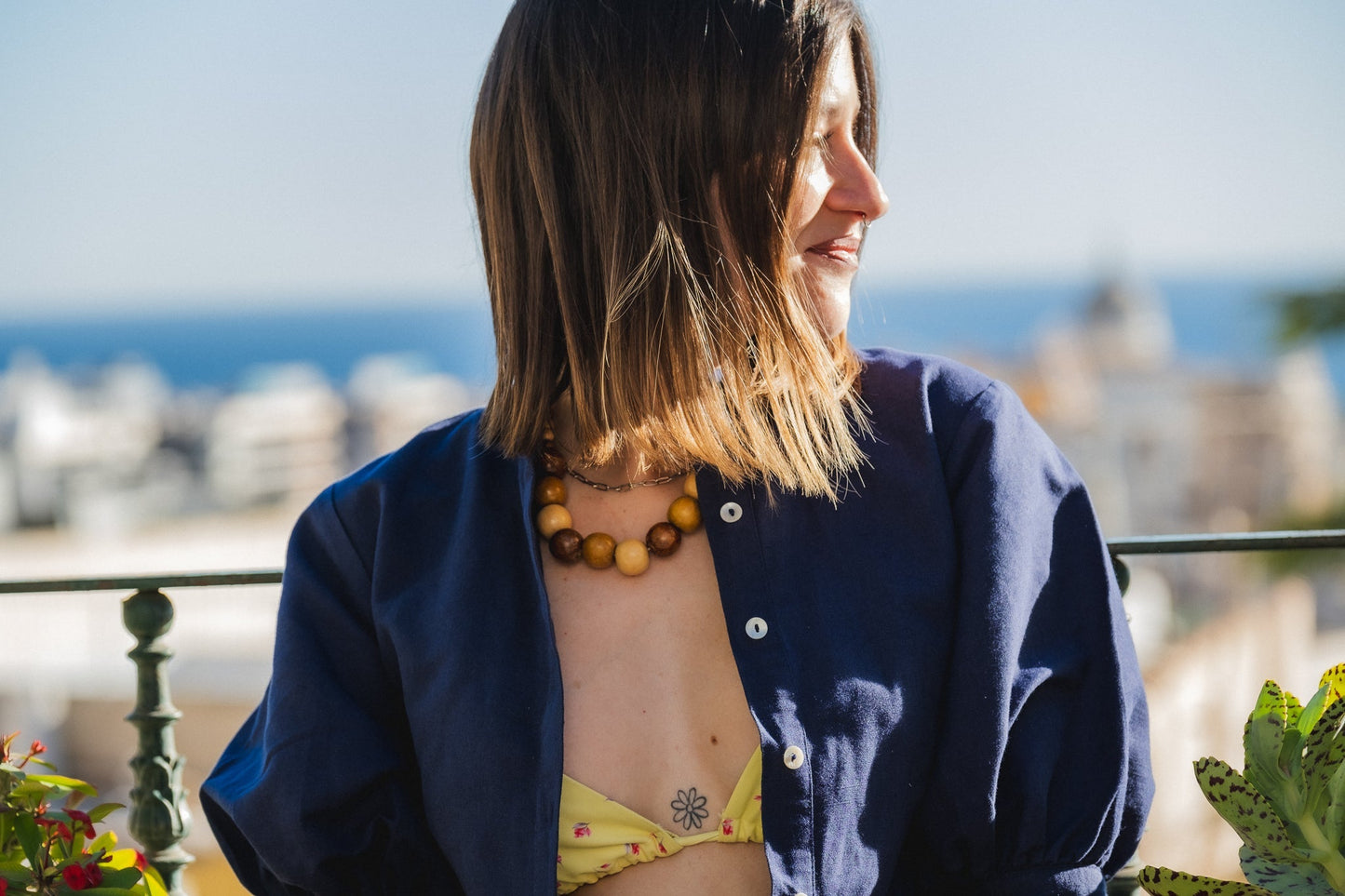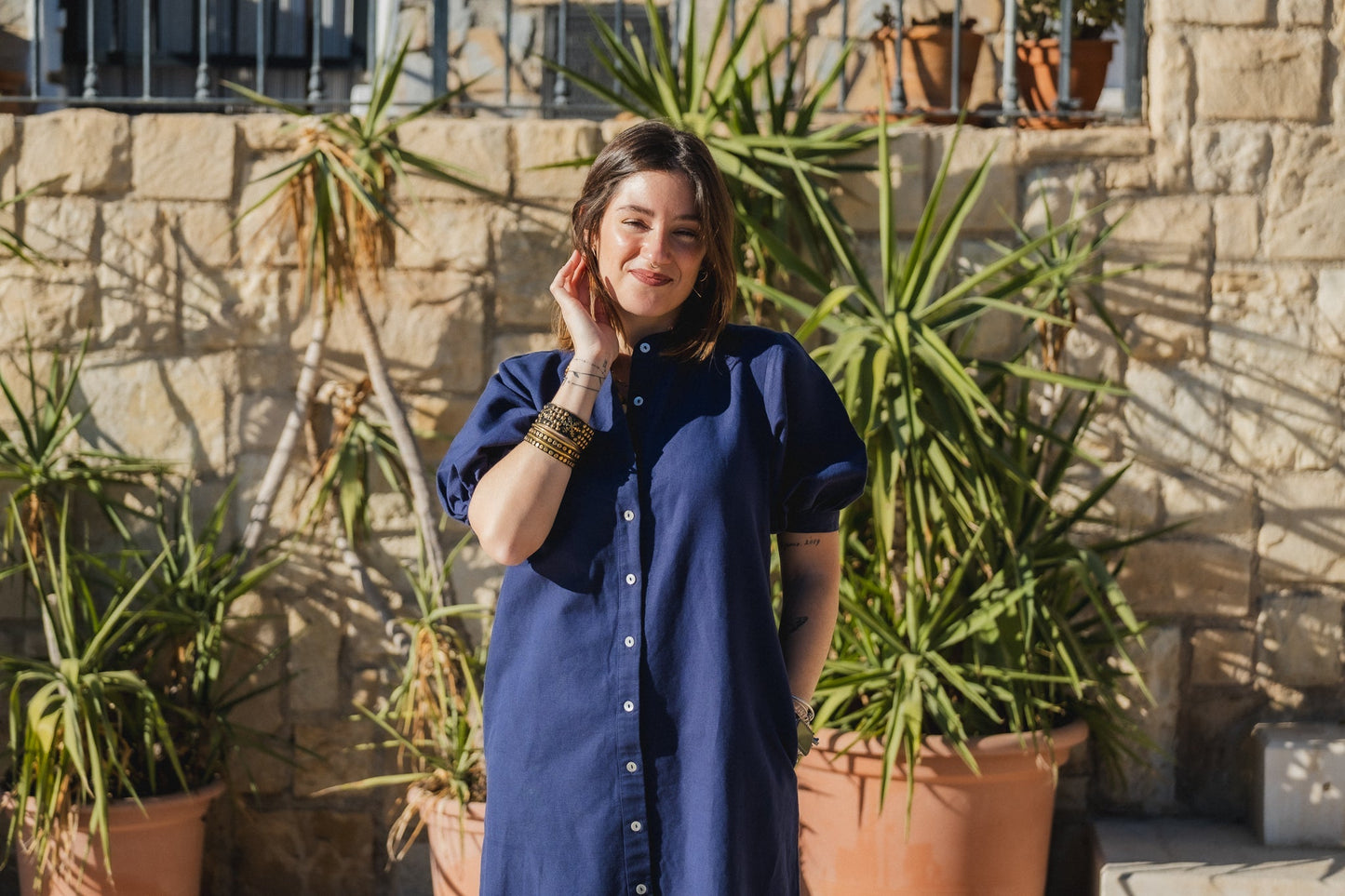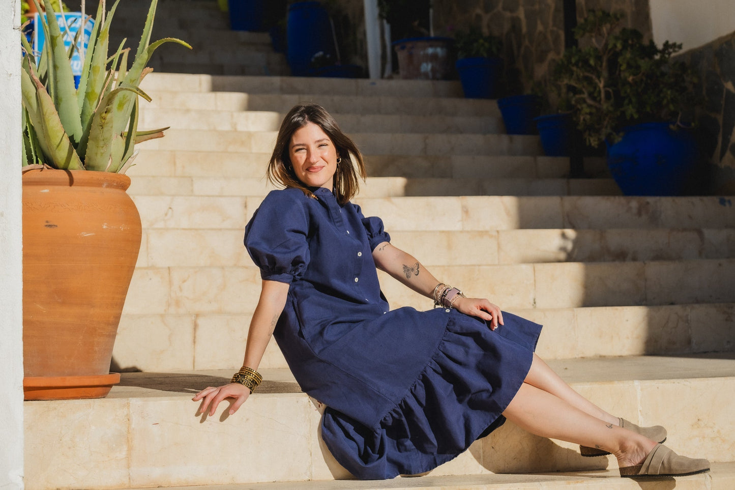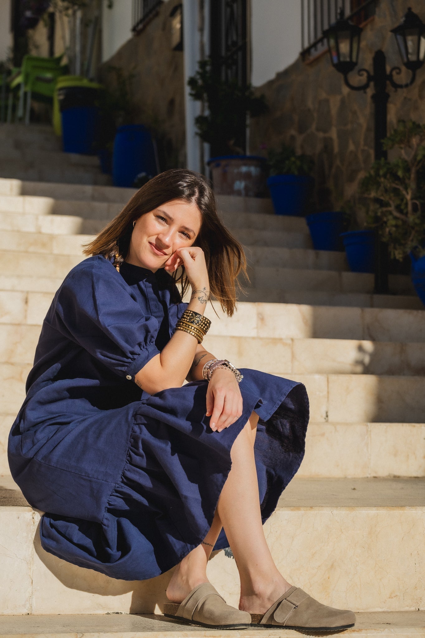 This linen and cotton blend dress is perfect for summer evenings, offering a blend of comfort and style. With its round collar band, buttoned short sleeves, and tiered, flared hem, it exudes elegance and charm. The heavier linen keeps you warm as the sun sets, making it ideal for both casual picnics and evening parties. Pair it with matte gold accessories to add a touch of glam