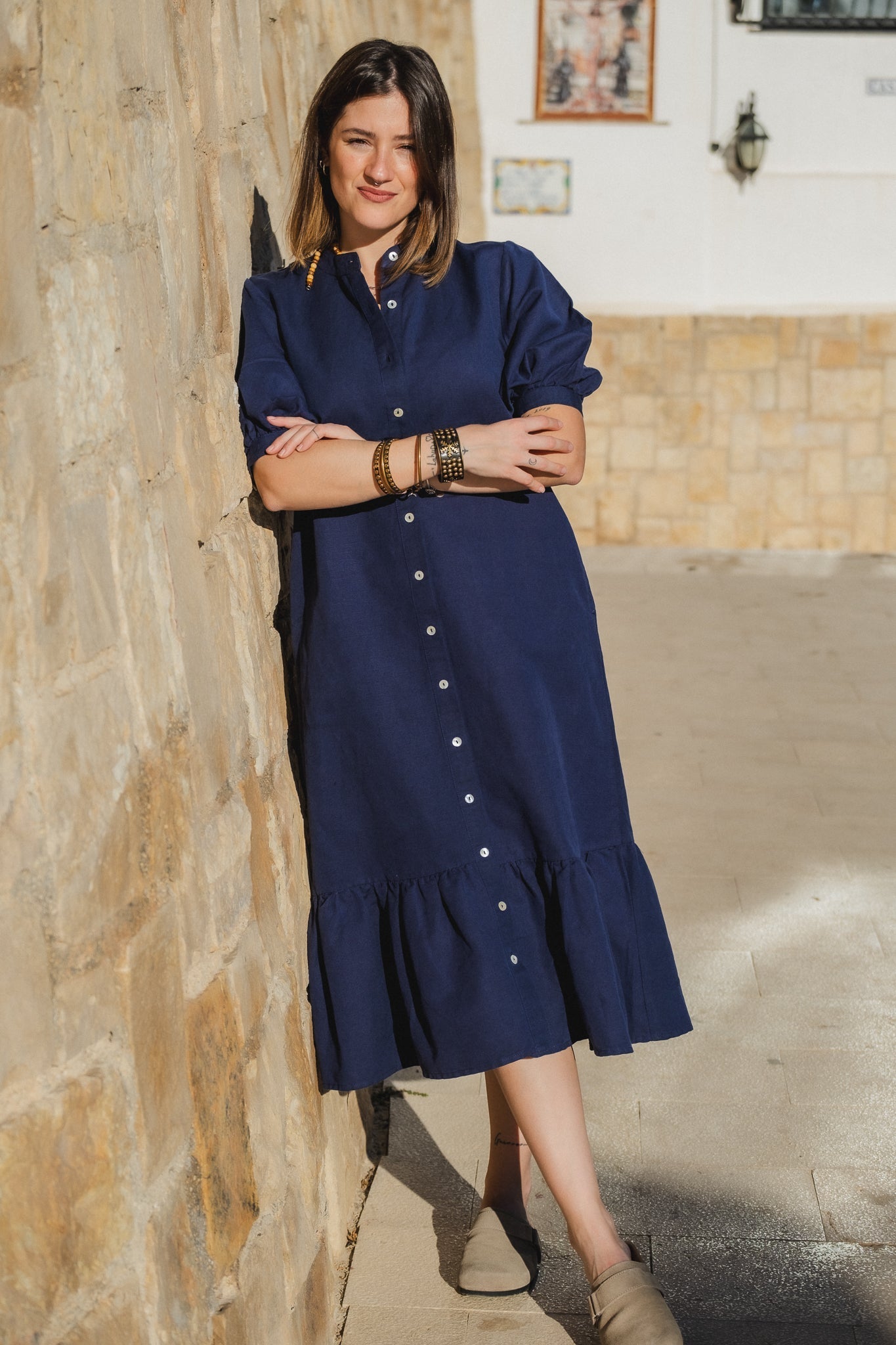 Regular price £45.00This linen and cotton blend dress is perfect for summer evenings, offering a blend of comfort and style. With its round collar band, buttoned short sleeves, and tiered, flared hem, it exudes elegance and charm. The heavier linen keeps you warm as the sun sets, making it ideal for both casual picnics and evening parties. Pair it with matte gold accessories to add a touch of glam