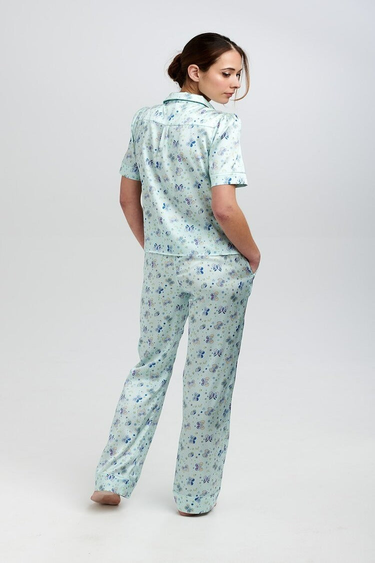 The Poppy silk blouse in Glacier Butterfly, finely tailored to give a closer fit but with enough stretch to allow for easy movement in bed. Made from the finest 19 momme silk, trimmed with matching glacier piping and adorned with our signature tonal shell button.