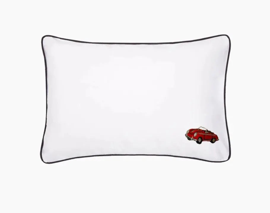 Each pillowcase is finished with refined black cord piping around the edges and a red vintage car embroidered in one corner — a subtle nod to slow drives, open windows, and golden-hour escapes.