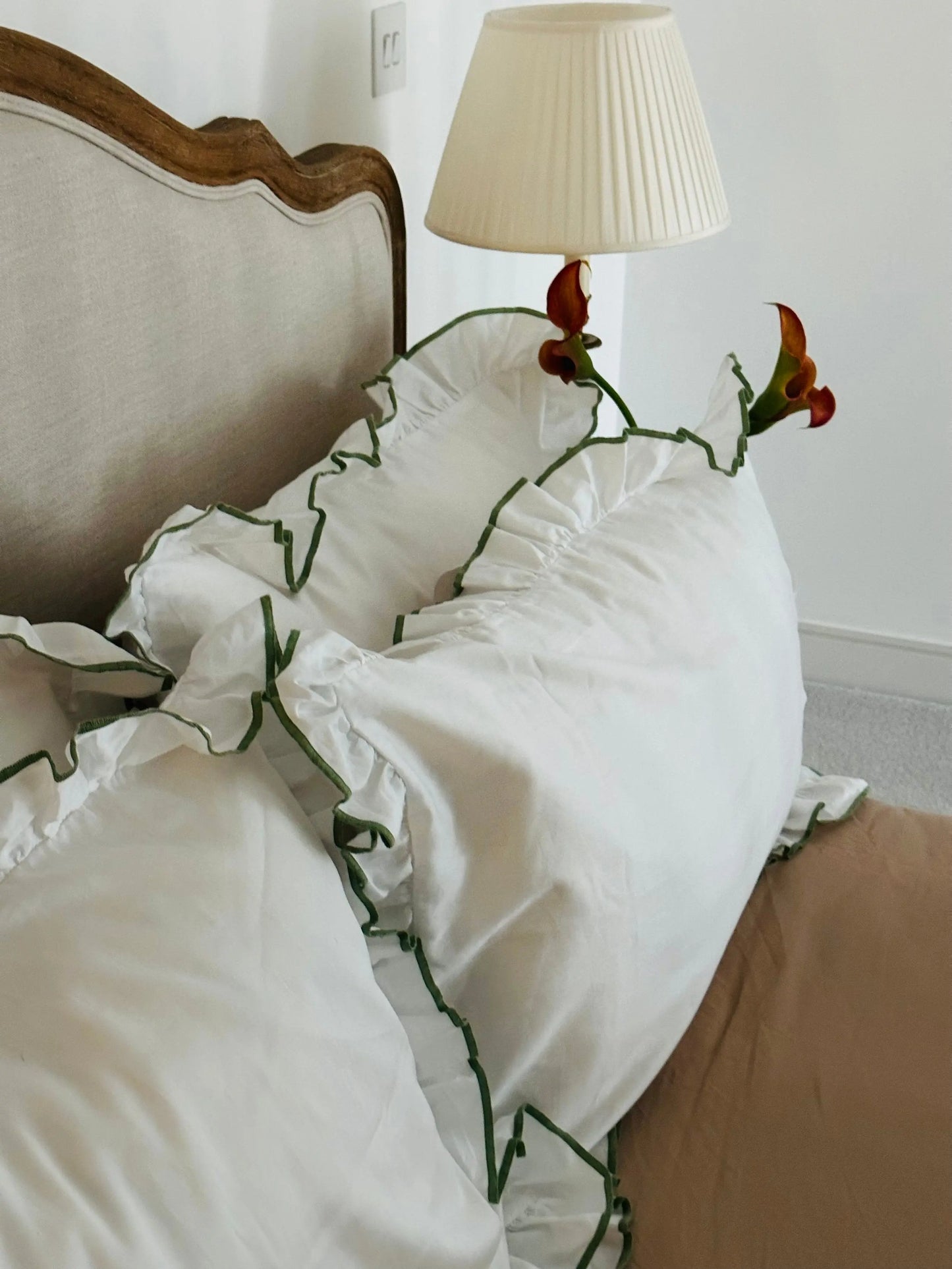 Introducing our enchanting Provence-inspired pillowcase, finished with a romantic frill and a soft sage green/olive trim. Designed to bring whimsical charm and quiet luxury to your bedroom, each pillowcase is crafted from rich, buttery soft cotton sateen that feels as indulgent as it looks.