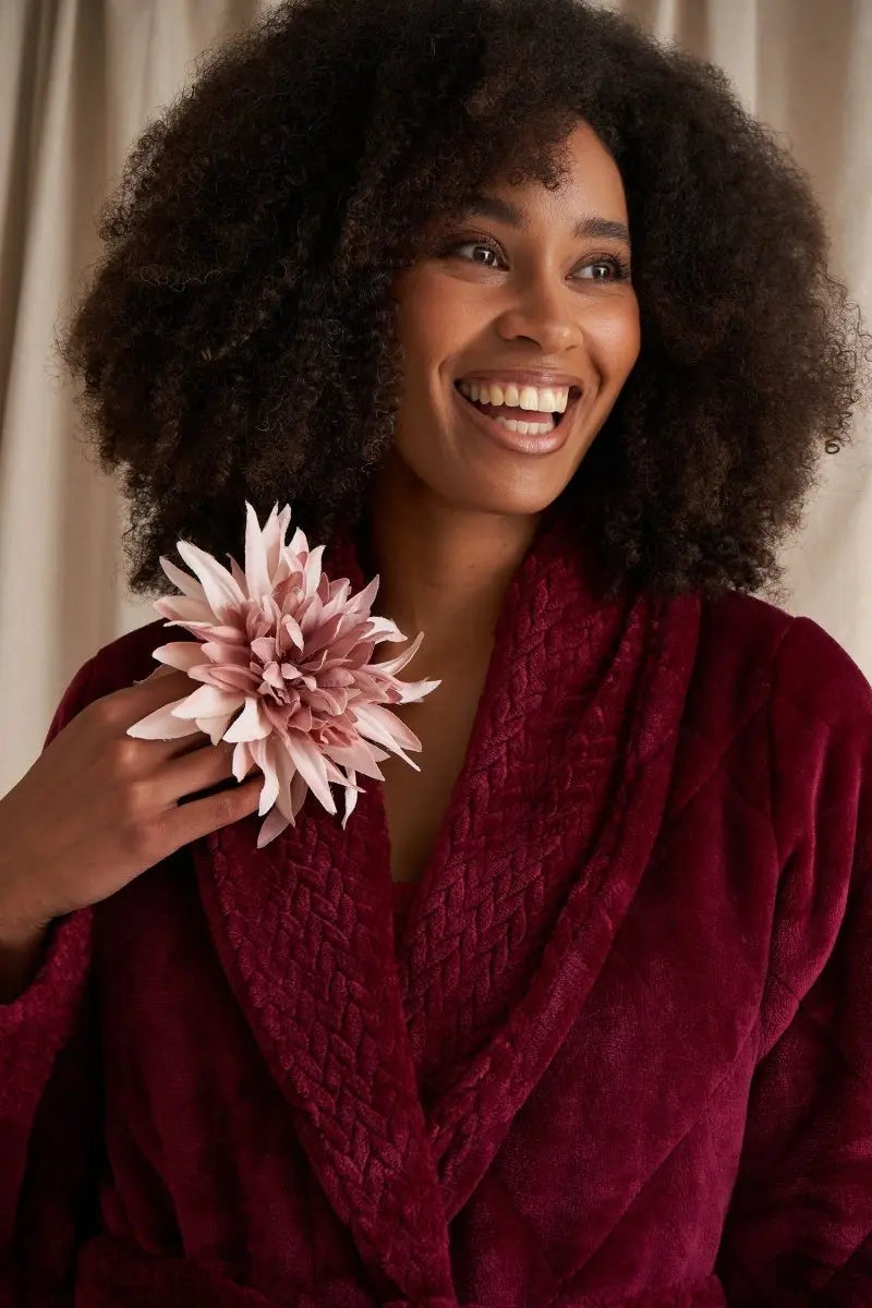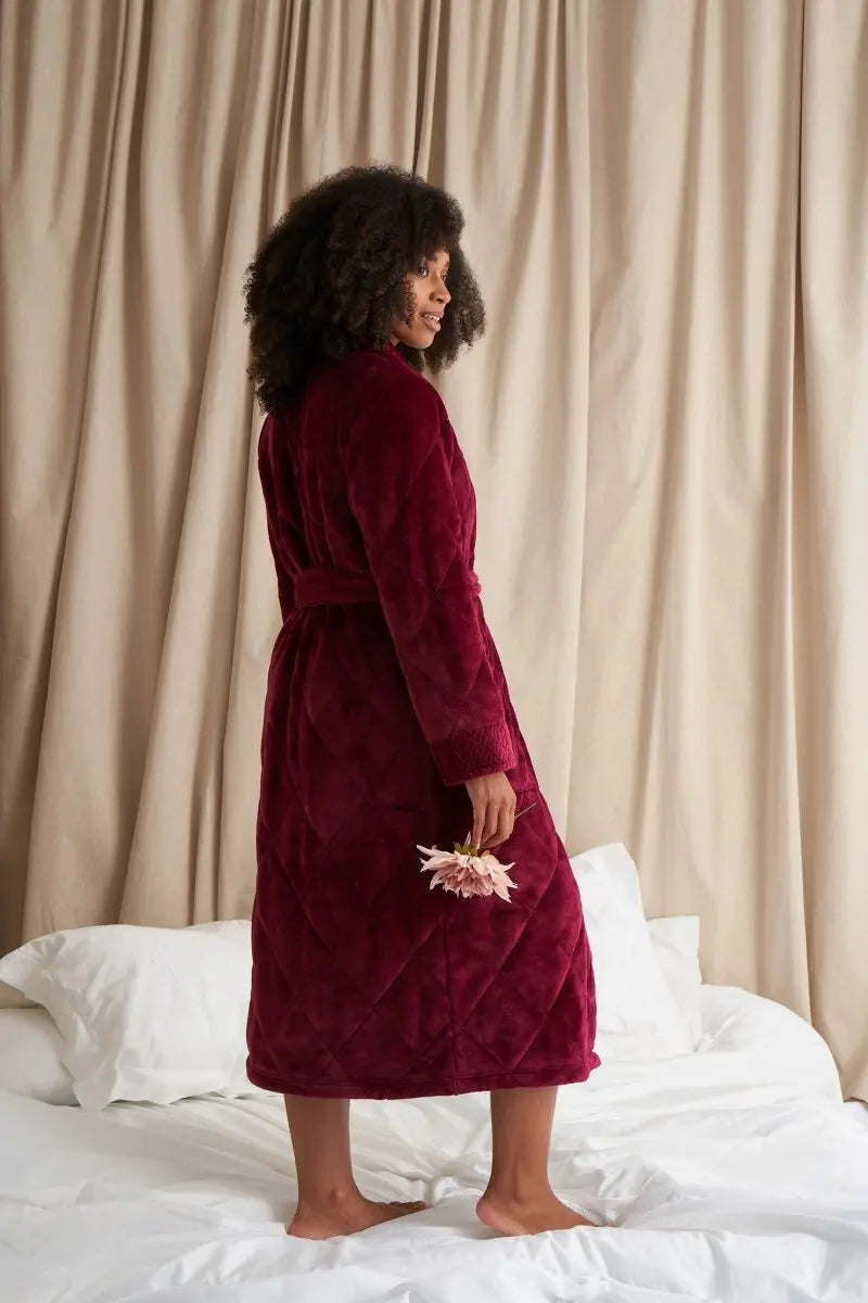 This may just be our most luxurious robe to date! Our Quilted Velour Robe has a silky-soft, generous shawl collar and extended length so you can really wrap up in luxury. This ladies dressing gown has deep functional pockets with internal and external ties for added security. Be cocooned in warmth this Autumn/Winter. Available in Bordeaux, Powder Puff and Raven. Pair with matching slippers, Gigi, for the complete look.