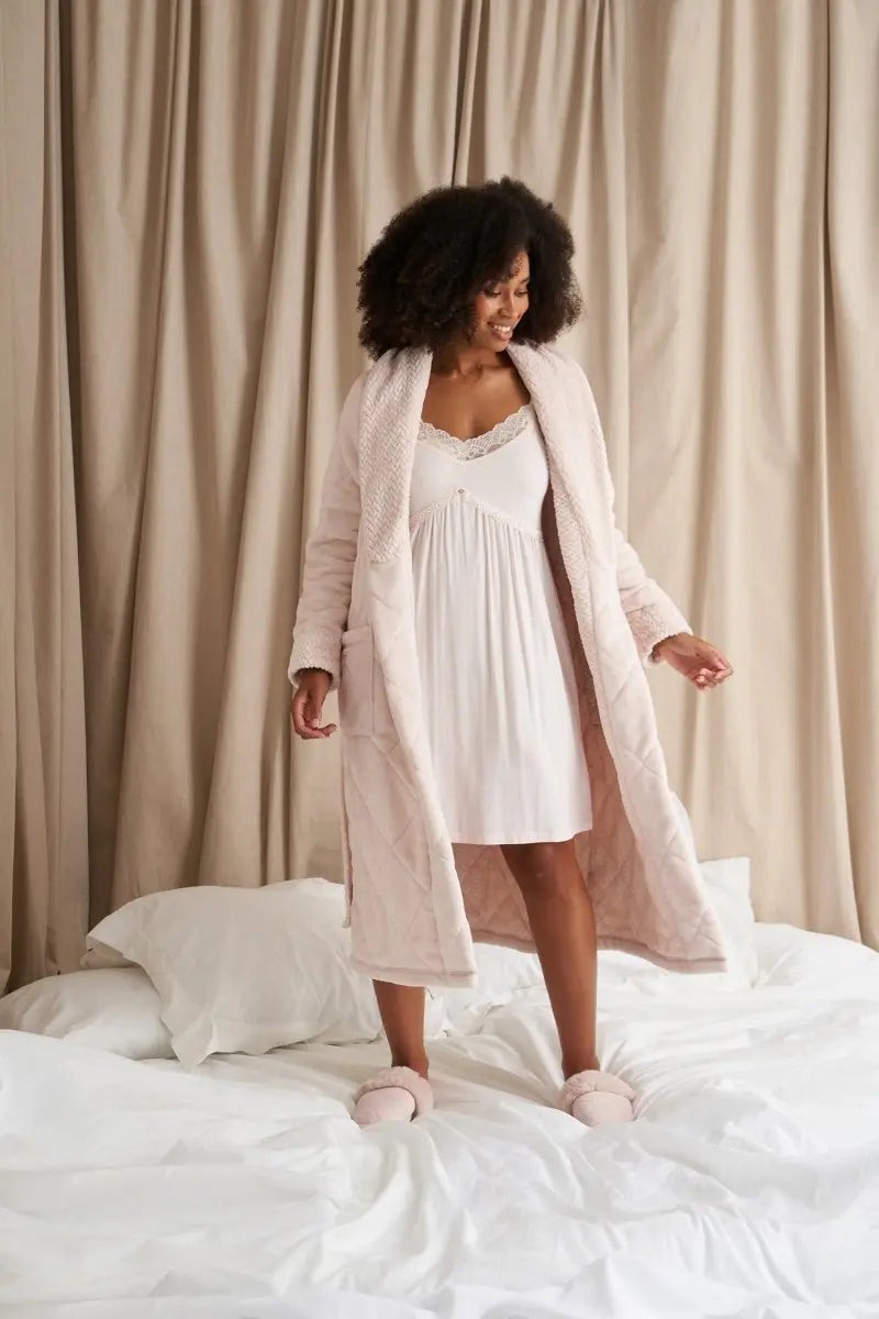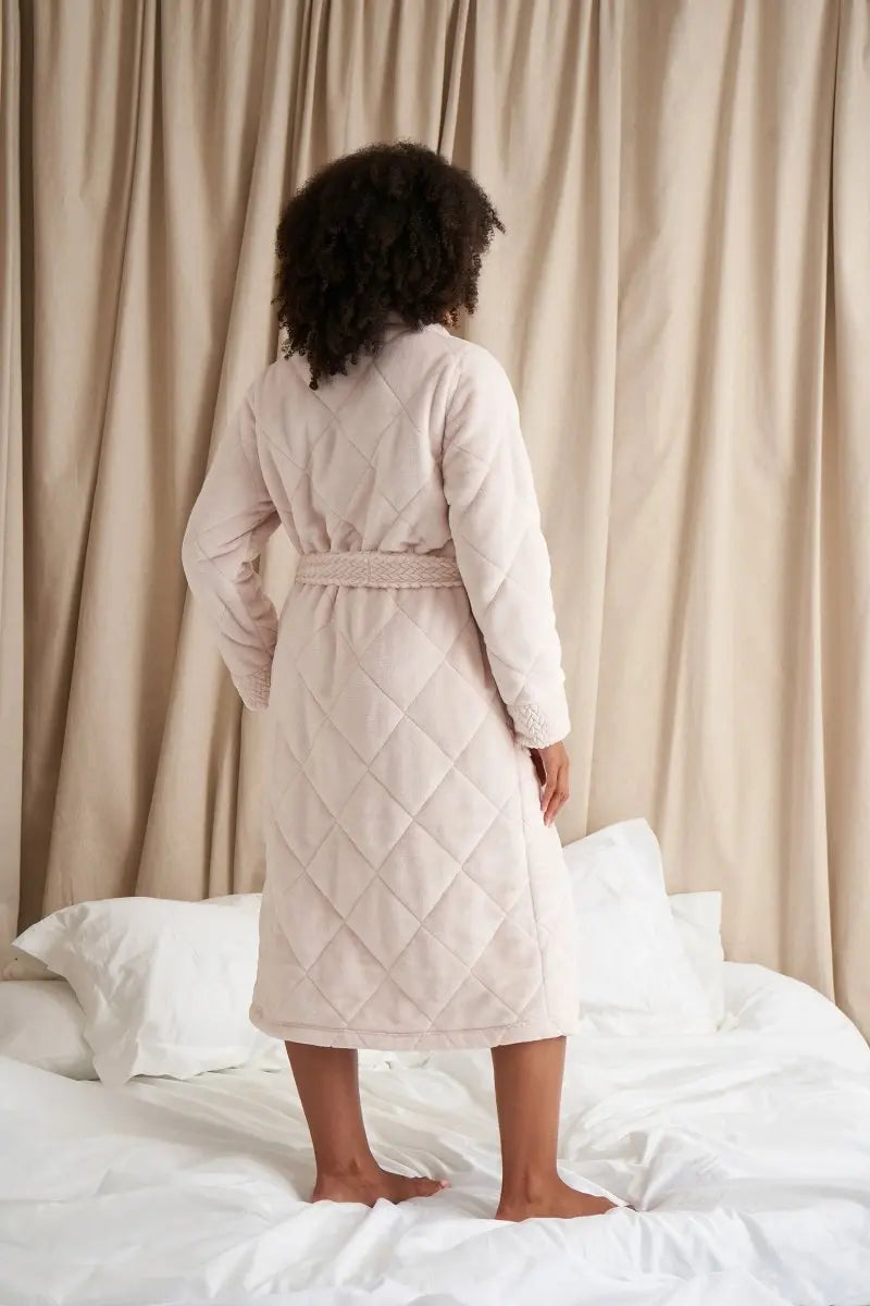 This may just be our most luxurious robe to date! Our Quilted Velour Robe has a silky-soft, generous shawl collar and extended length so you can really wrap up in luxury. This ladies dressing gown has deep functional pockets with internal and external ties for added security. Be cocooned in warmth this Autumn/Winter. Available in Bordeaux, Powder Puff and Raven. Pair with matching slippers, Gigi, for the complete look.