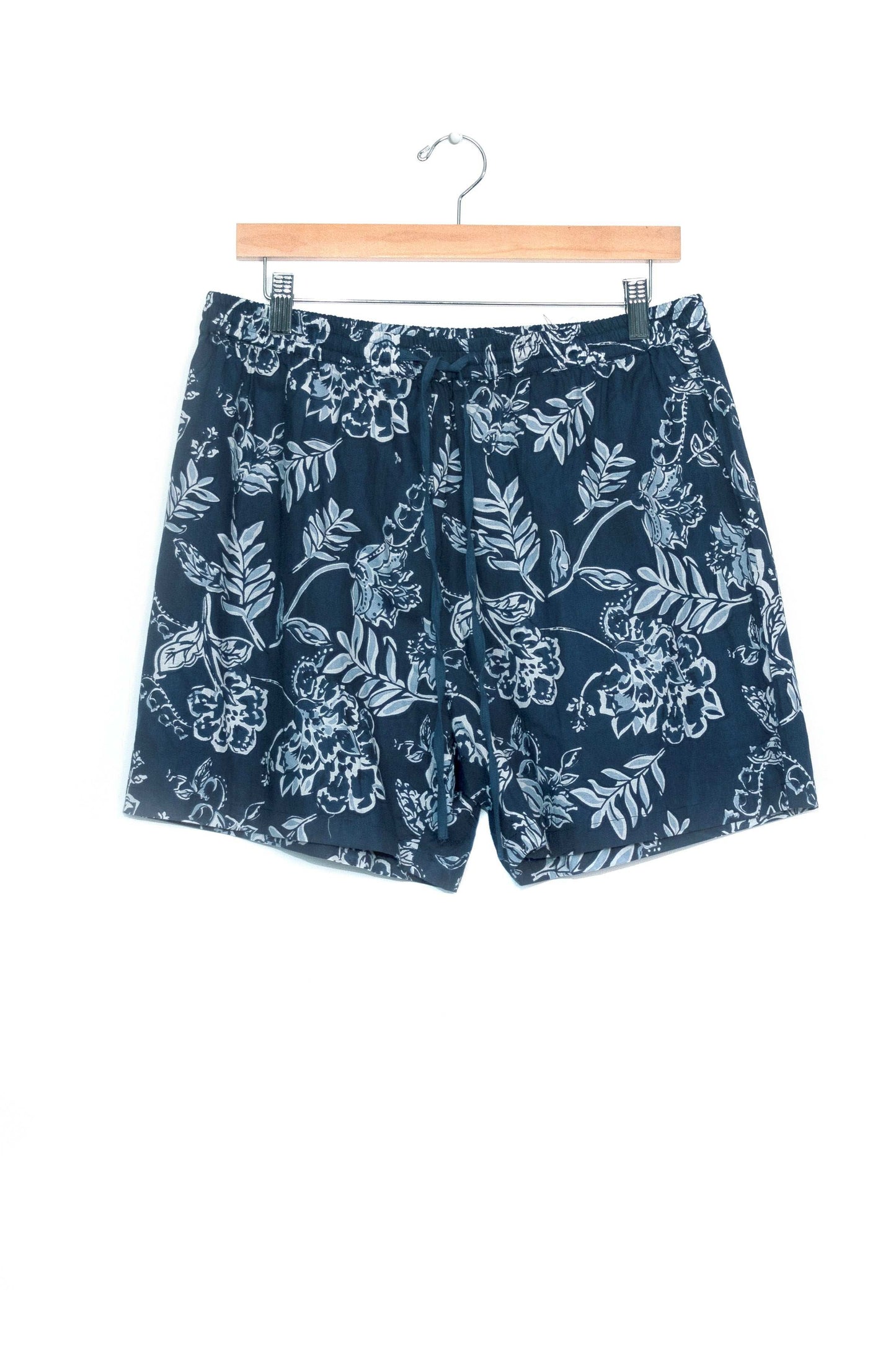 Our Rain women's short pyjamas set is inspired by Great British Spring showers. These luxury pjs feature a roomy rib knit white tank top and printed shorts pyjama bottoms, featuring a bold navy and white pattern. The soft cotton-rich cami contrasts with the 100% cotton shorts, highlighting the white and blue floral pattern.