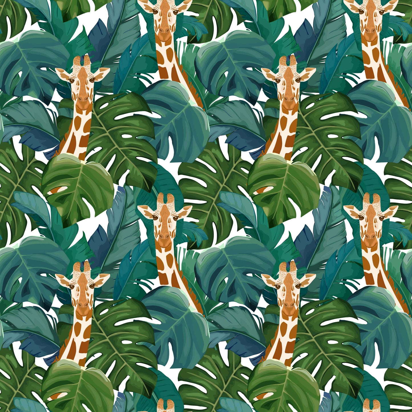 Our tropical giraffe wallpaper is great for bringing a sense of joy into your home. As you immerse yourself in this vibrant design, a lush blend of tropical leaves and gracefully portrayed giraffes transports you to a realm of tropical paradise.