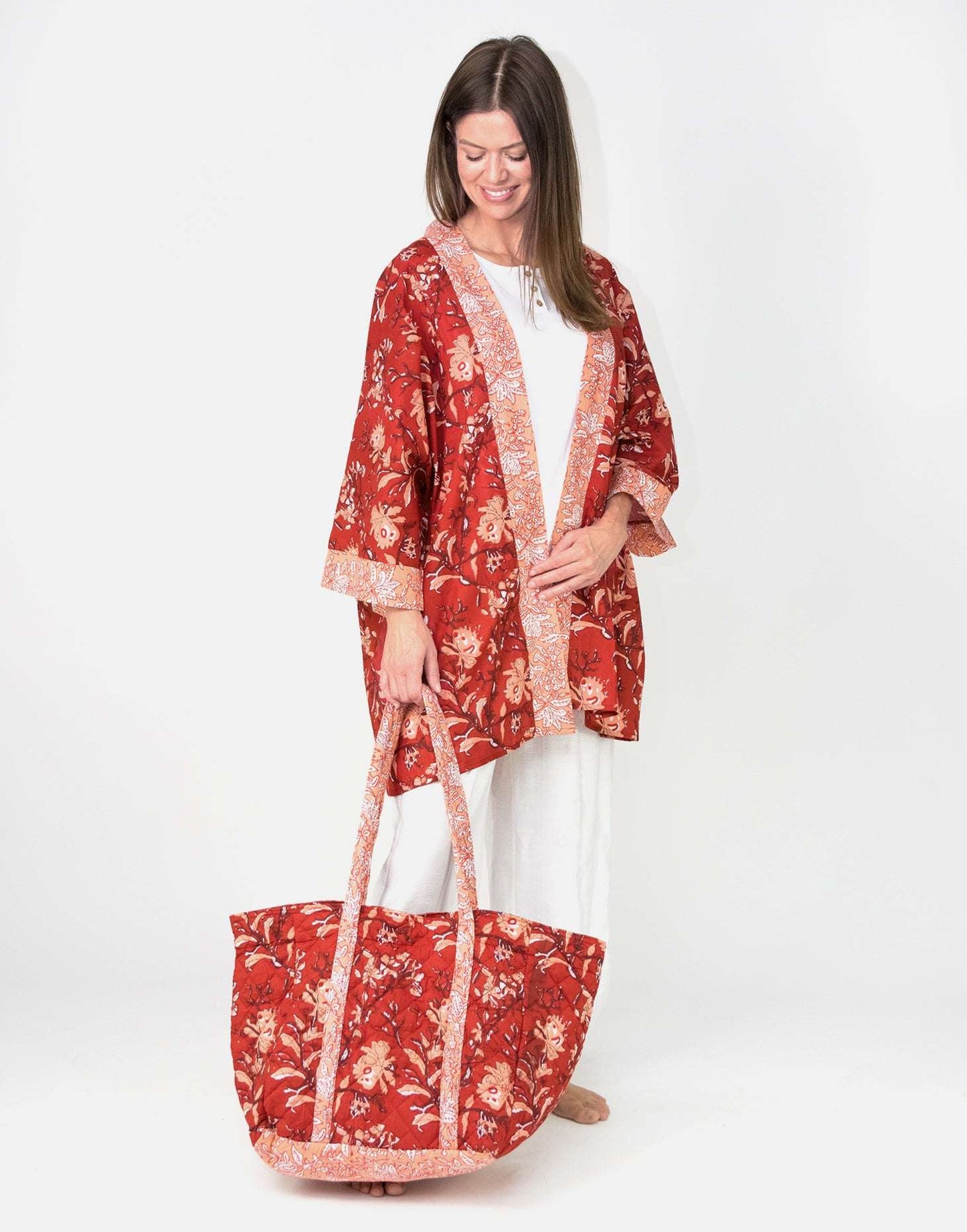 Our Red Rubra tote bag has a pattern inspired by the sprawling sea of star dunes in the Sahara Desert. Generous in size with contrast handles and a bold blue pattern, this classic tote holds all of your everyday essentials, and makes a great laptop bag, grocery bag, or travel tote. Made from 100% Indian cotton, this tote is durable, soft, and has a fiery red pattern.