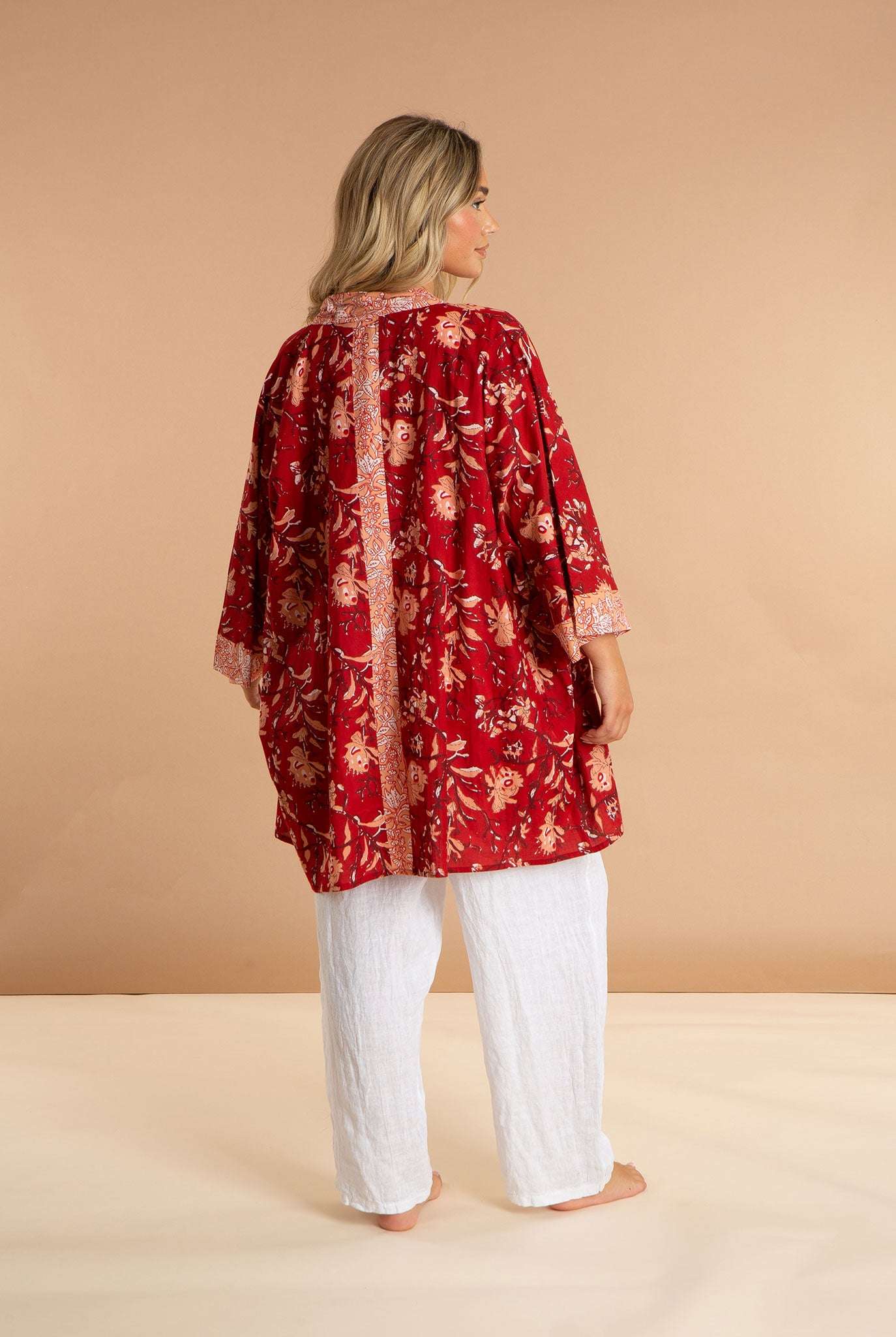 Our Red Rubra women's cotton kimono is inspired by the sprawling sea of star dunes in the Sahara Desert. Featuring classic squared sleeves, a short length, and contrast banding, this luxury dressing gown is made from soft and breathable 100% Indian cotton, which is carefully printed and pre-washed. The bold pattern is at home both as loungewear, or when worn to the beach or as a summer layer.