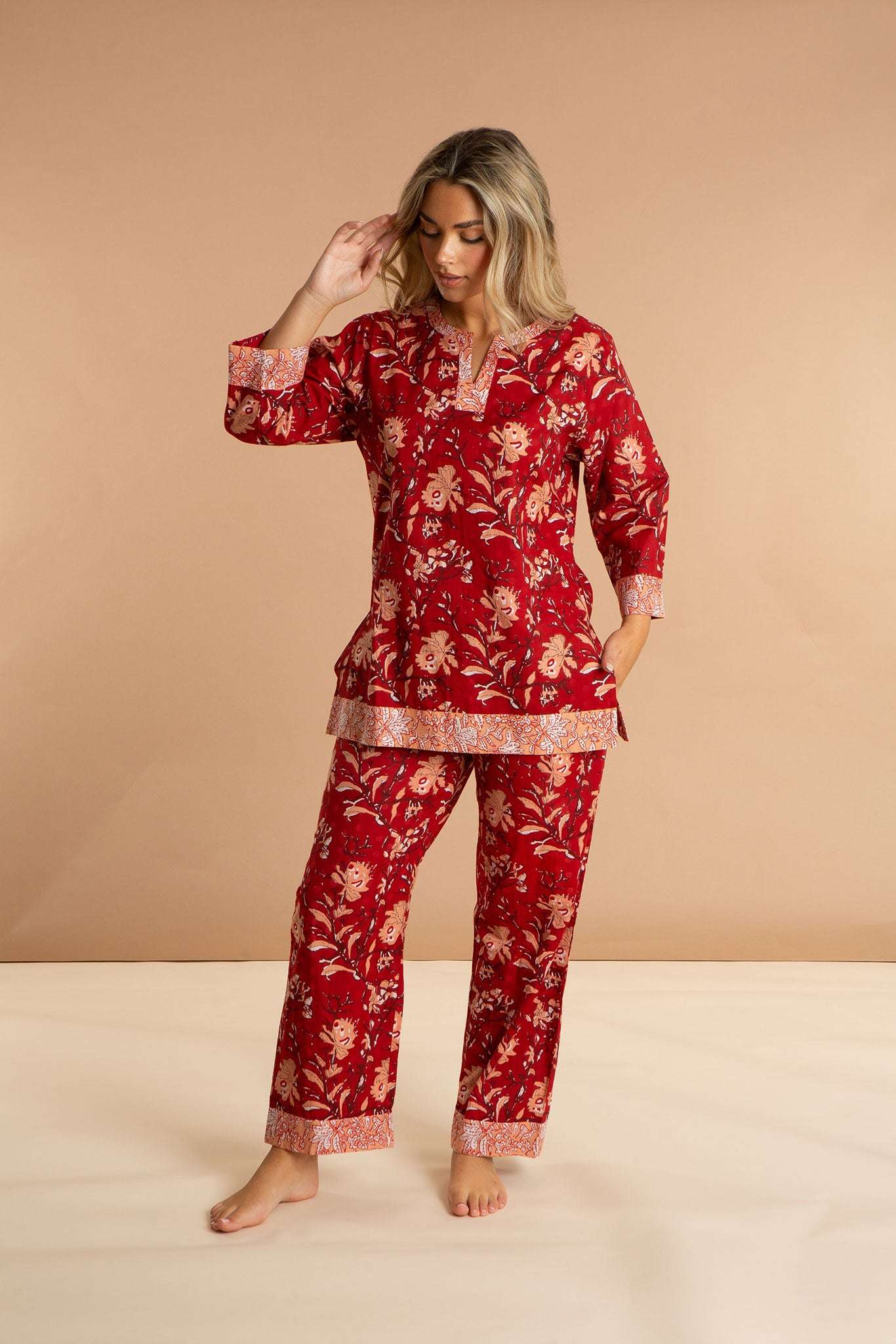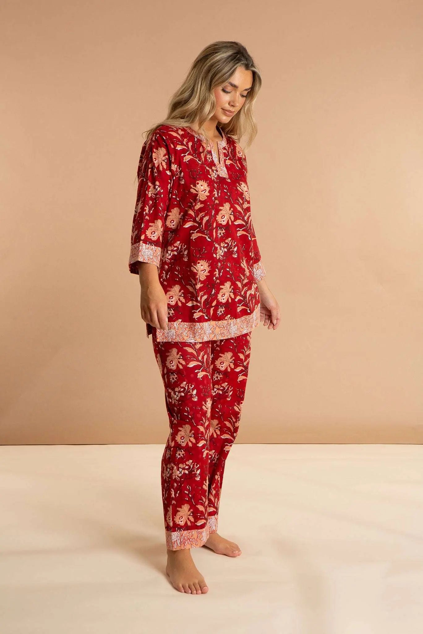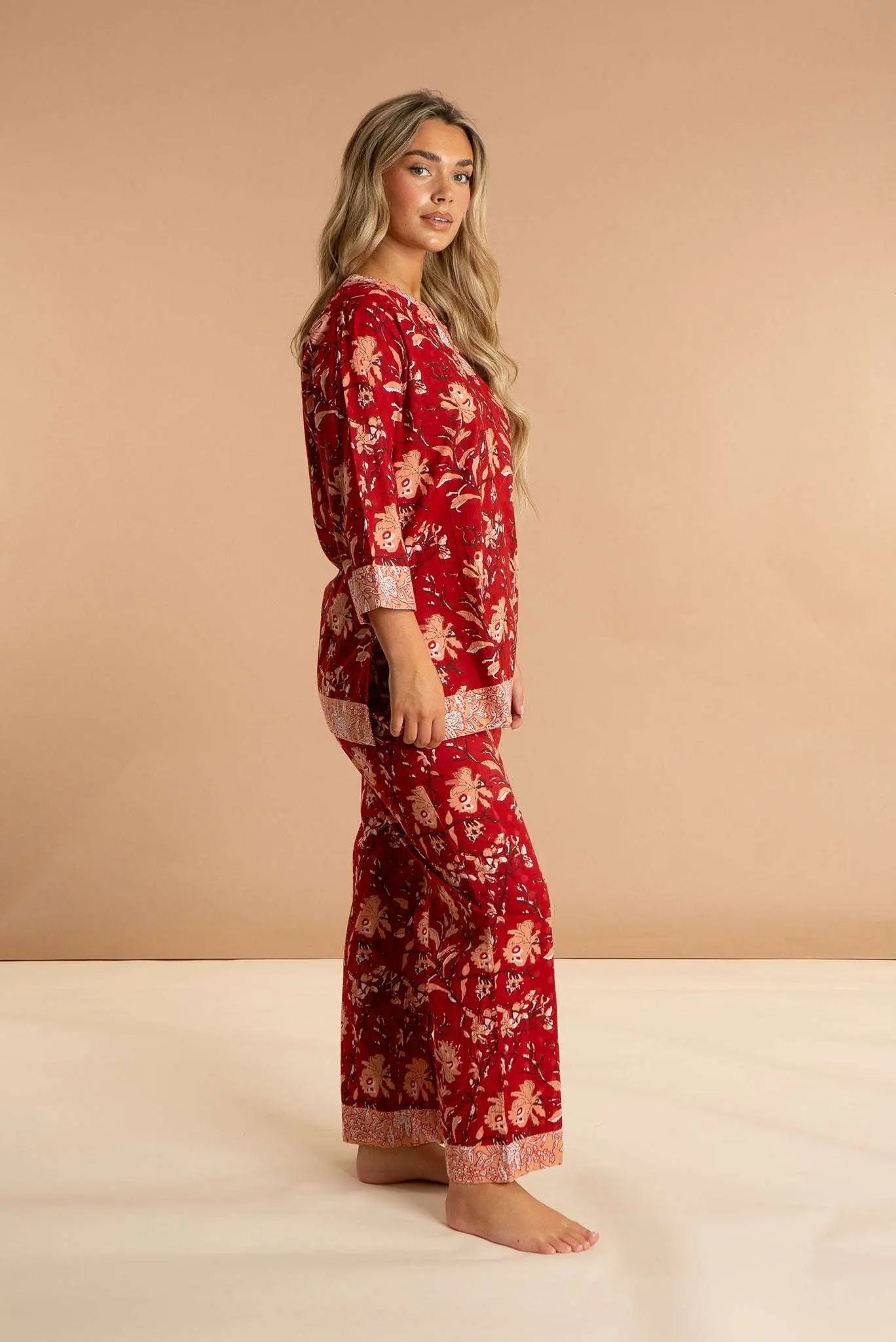 Our Red Rubra women's cotton pyjamas set is inspired by the sprawling sea of star dunes in the Sahara Desert. These luxury pjs feature a 3/4-sleeved split neckline loose top and straight leg pyjama bottoms with pockets, which are carefully printed and pre-washed, leaving the soft and breathable 100% Indian cotton a dream to wear. Our bold printed loungewear compliments both your early nights and late mornings.
